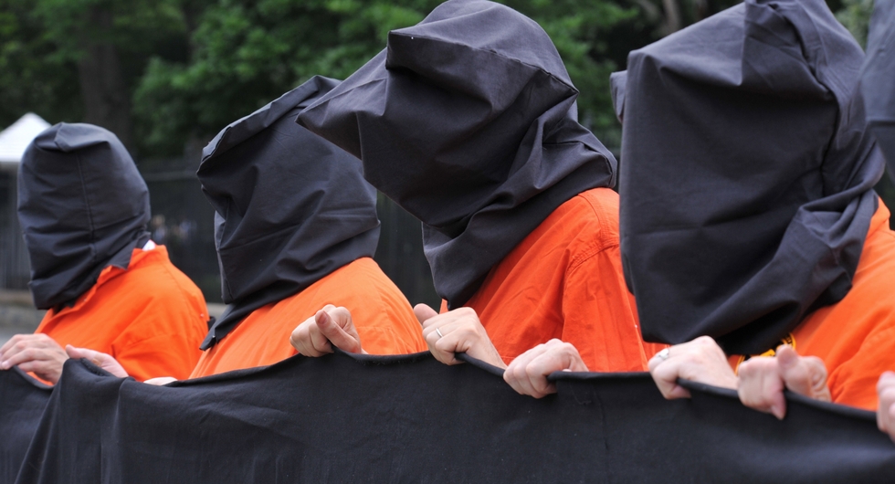 Photo: Anti-torture activists dressed in the orange jumpsuits and black hoods demonstrate to close Guantanamo, end indefinite detention, repudiate US Military Commissions, and resist any effort to reauthorize torture in the form of “enhanced interrogations” on 23 June, 2011 in front of the White House in Washington, DC (AFP).