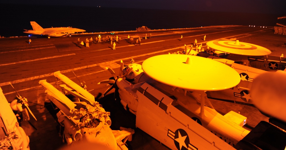 Photo: An F/A-18C Hornet to launch from the flight deck of the aircraft carrier USS George H.W. Bush in the Arabian Gulf on 23 September, 2014 (AFP/NAVY MEDIA/HO/ Robert Burck)