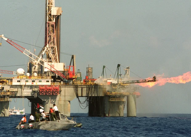 Photo: Palestinians look at the drilling operation launched 27 September 2000 to tap a gas field off the coast of Gaza (AFP).