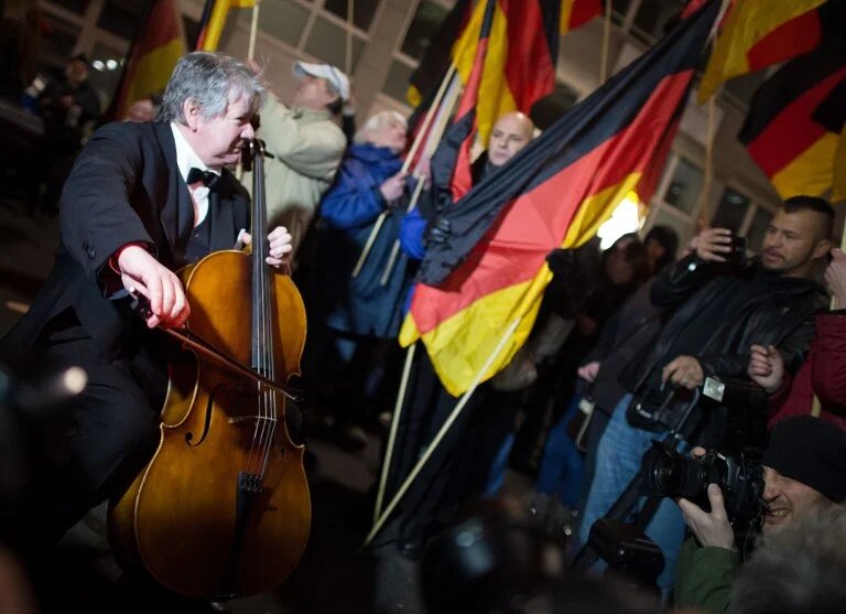 Photo: German cellist Thomas Beckmann plays to protest against the Pegida movement demonstrating in Duesseldorf, Germany, on 12 January (AFP)