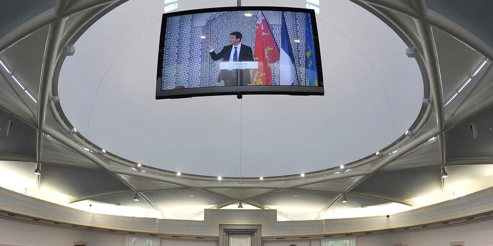 Photo: France's then Interior Minister Manuel Valls is seen on a giant screen as he gives a speech during the official inauguration of the Strasbourg Grand Mosque on 27 September, 2012 (AFP) .