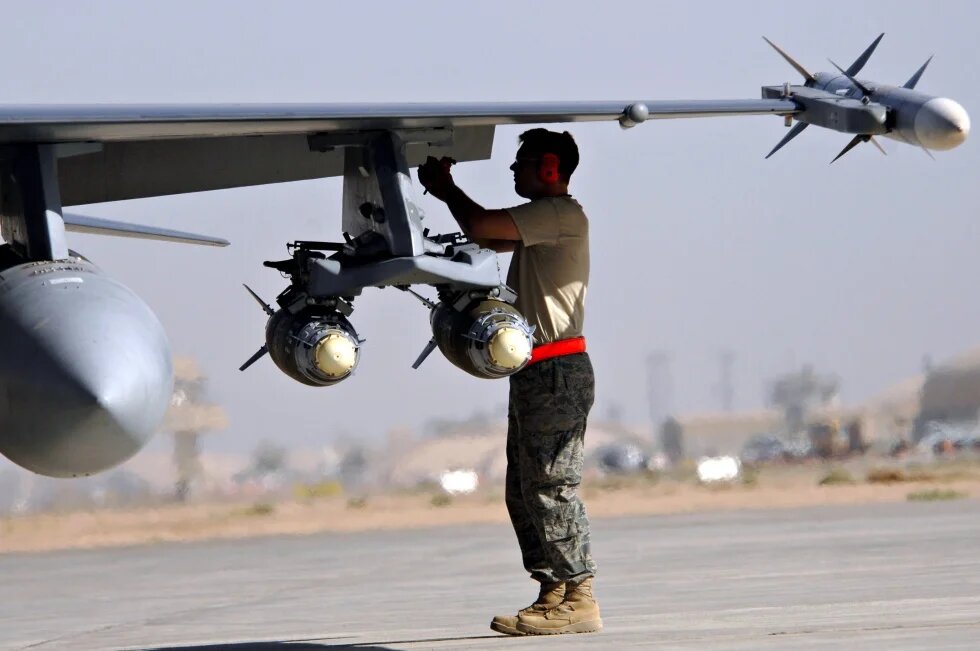 A US Air Force airman assigned to the 332nd Expeditionary Aircraft Maintenance Squadron arms an F-16 Fighting Falcon aircraft at Joint Base Balad in the Iraqi town of Balad, on 18 June, 2008 (AFP)
