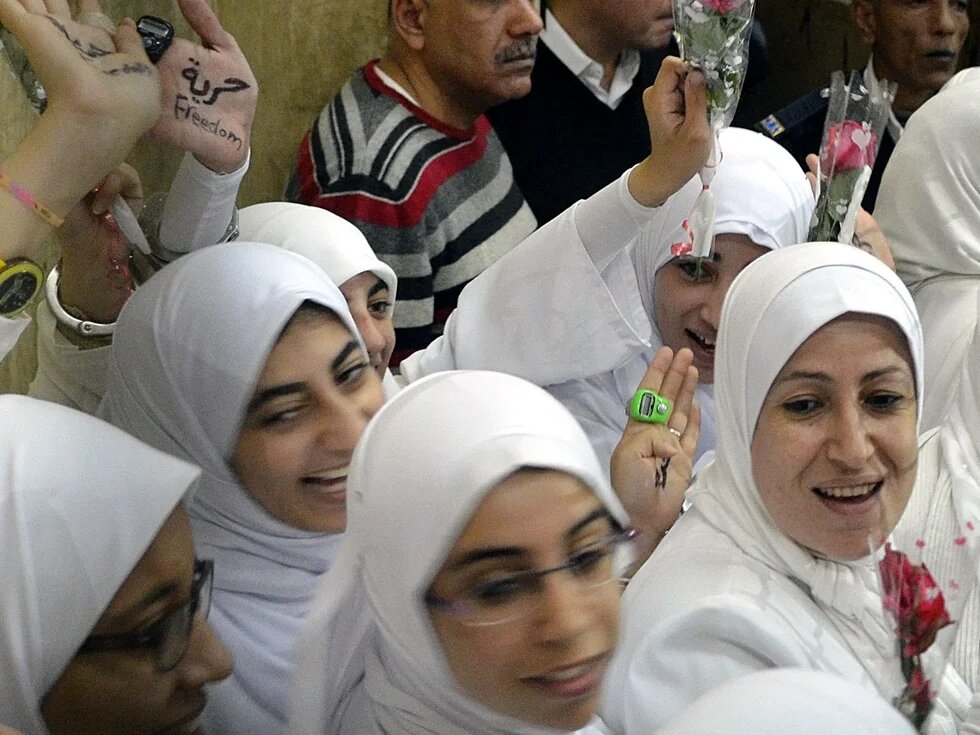Photo: Egyptian women members of the Muslim Brotherhood hold roses as they stand in the defendants' cage dressed in prison issue white during their trial in at the court in the Egyptian Mediterranean city of Alexandria on December 7, 2013 (AFP).