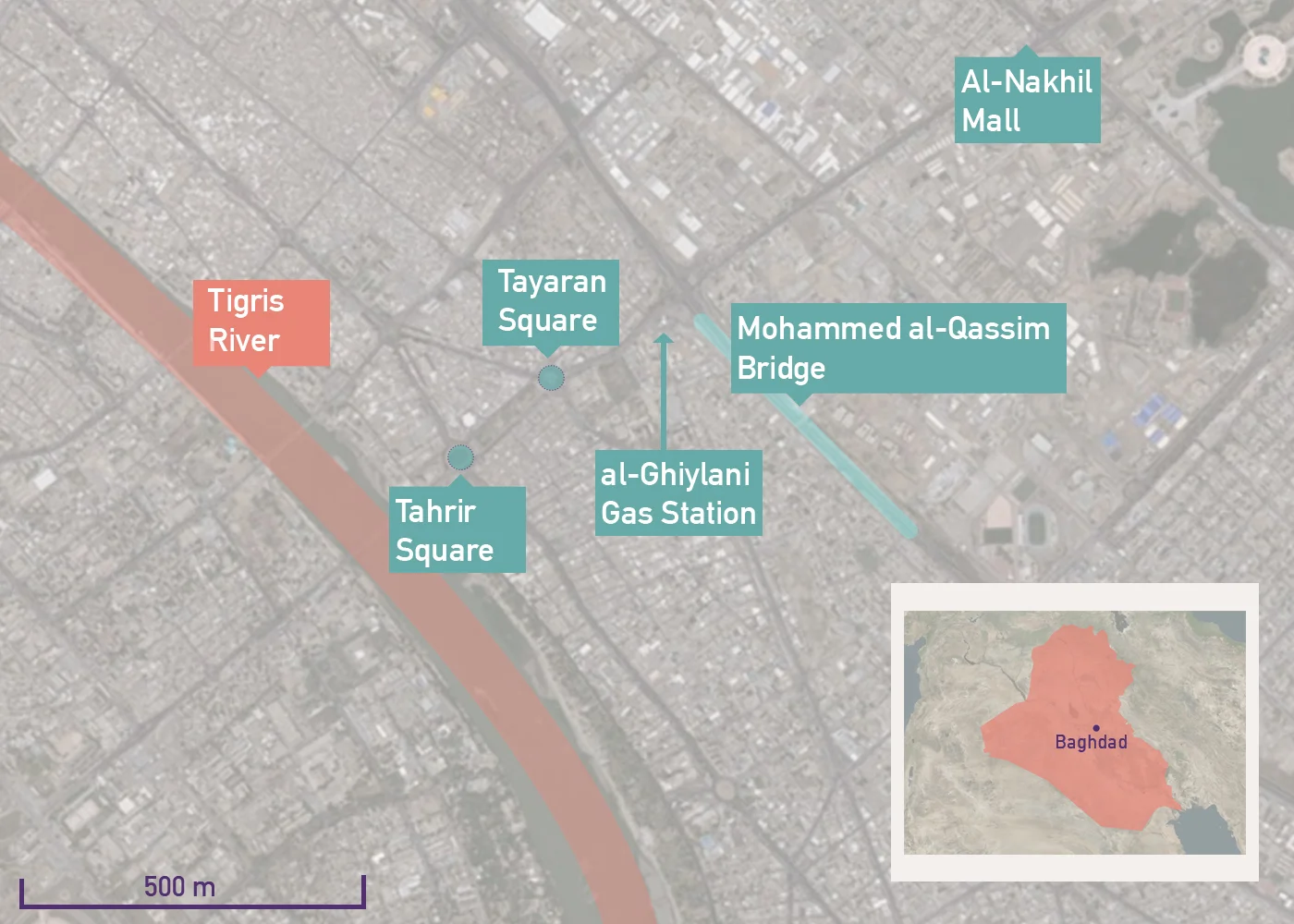 MEE has found that 32 protesters may have been killed in the attack near al-Nakheel Mall. Further, evidence seen by MEE has raised questions about whether the al-Nakheel attack was only a snapshot of systematic violence perpetrated by security forces in Baghdad over several days that October.