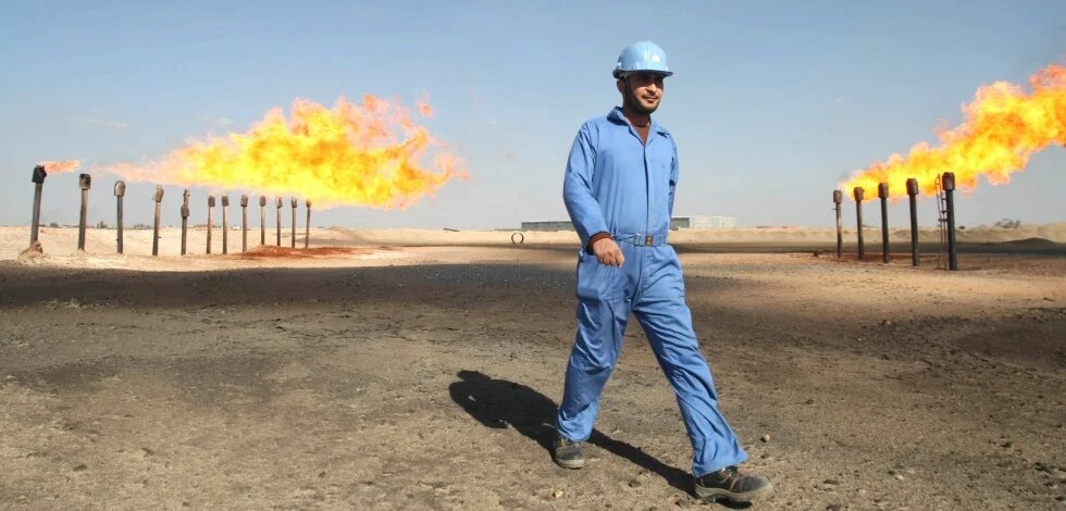 Photo credit: An engineer walking past chimneys at the Barjisiya oil fields in Iraq on February 3, 2009 (AFP)