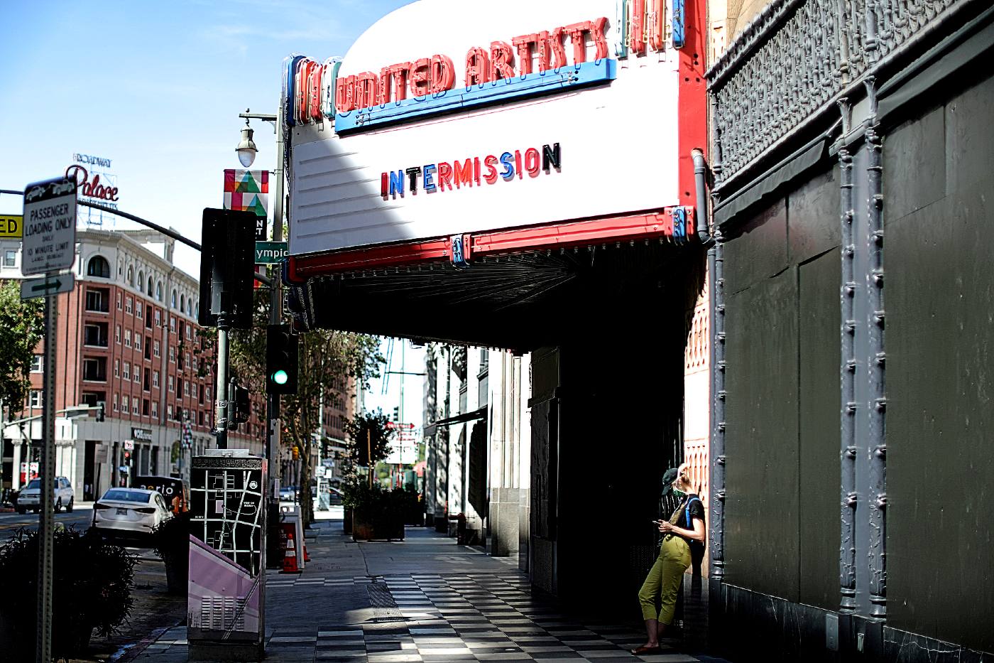 Photo: A woman stands under an entrance to a cinema, closed due to the outbreak of coronavirus in Los Angeles, in May 2020 (Reuters)