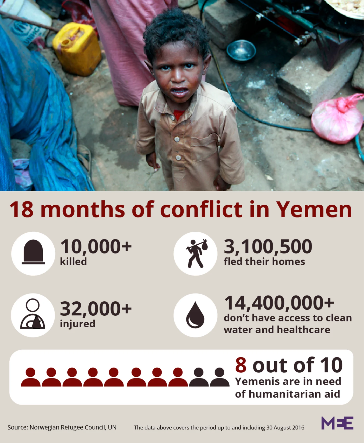 On Tuesday, Jamie McGoldrick, the UN's humanitarian coordinator, told a press conference that at least 10,000 people were estimated to have died and three million Yemenis had been forced to flee from their homes. According to the World Food Organisation, much of the country is on the verge of starvation.