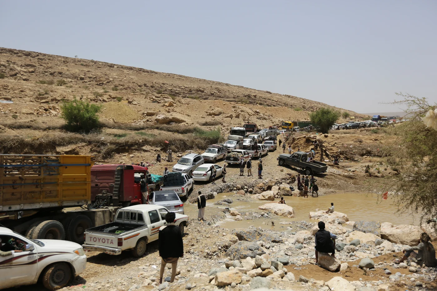 Khaywan Bridge, a two-hour drive north of Sanaa, had been destroyed, causing a tailback of lorries stretching for almost a mile as they prepared to cross the river by an improvised ford alongside the smashed bridge.