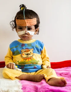 Then the first air strike hit and 13-year-old Naria received deep shrapnel wounds in her arm. Naria was in deep pain, and regularly suffers convulsions of terror when aircraft go overhead. They are so serious that she needs to be forcibly held down. Her right hand is withered.