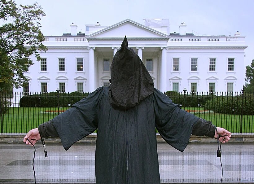 Photo: A demonstrator, dressed as an Abu Ghraib prisoner poses 17 October, 2006 in front of the entrance to the White House in Washington (AFP)