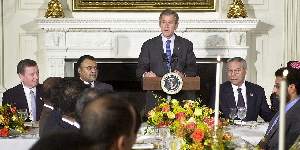 Photo: US President George W. Bush, with US Attorney General John Ashcroft (L), Saudi Ambassador Prince Bandar bin Sultan bin Abd al-Aziz al-Saud (2nd-L) and US Secretary of State Colin Powell, speaks 19 November 2001 before a prayer by Imam Abdullah Muhammad Khouj during a Ramadan dinner in the East Room of the White House in Washington, DC. (AFP)