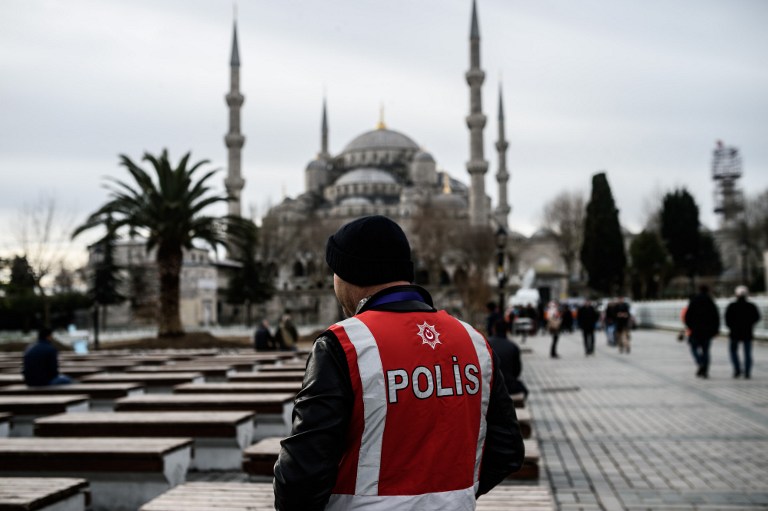 Photo: A Turkish police officers stands guard on 15 January, 2016 near a makeshift memorial in tribute to the victims of January 12 deadly attack at the Istanbul's tourist hub of Sultanahmet in Istanbul (AFP).