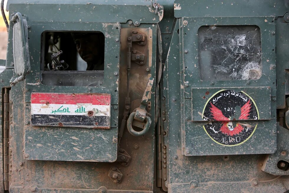 Photo: An Iraqi soldier sits inside a Humvee, bearing the national flag and brigade badge, as troops and allied paramilitaries advance on 6 December, 2015 down a street in Husayba, an Iraqi rural town in the Euphrates Valley seven kilometres east of Ramadi (AFP).