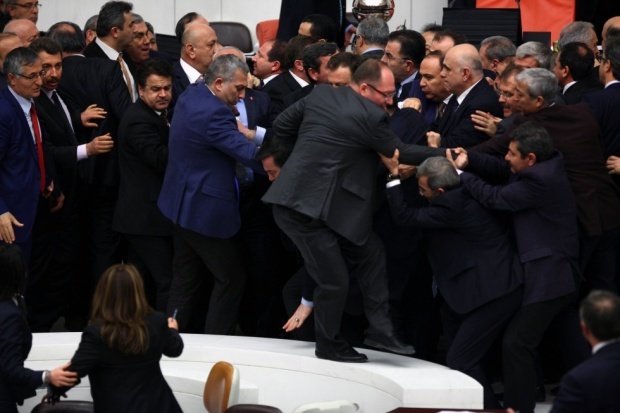 Légende photo : des parlementaires turcs de l'opposition et du parti AKP se bagarrent au cours d'un débat sur un projet de loi sur la sécurité (AFP).