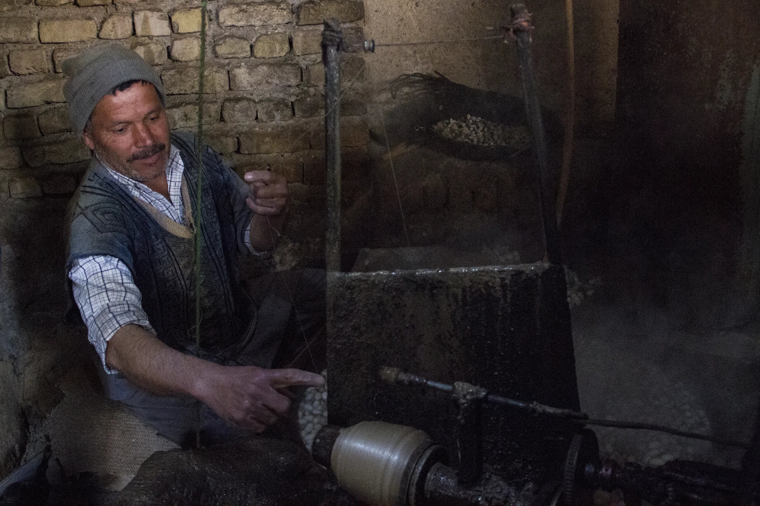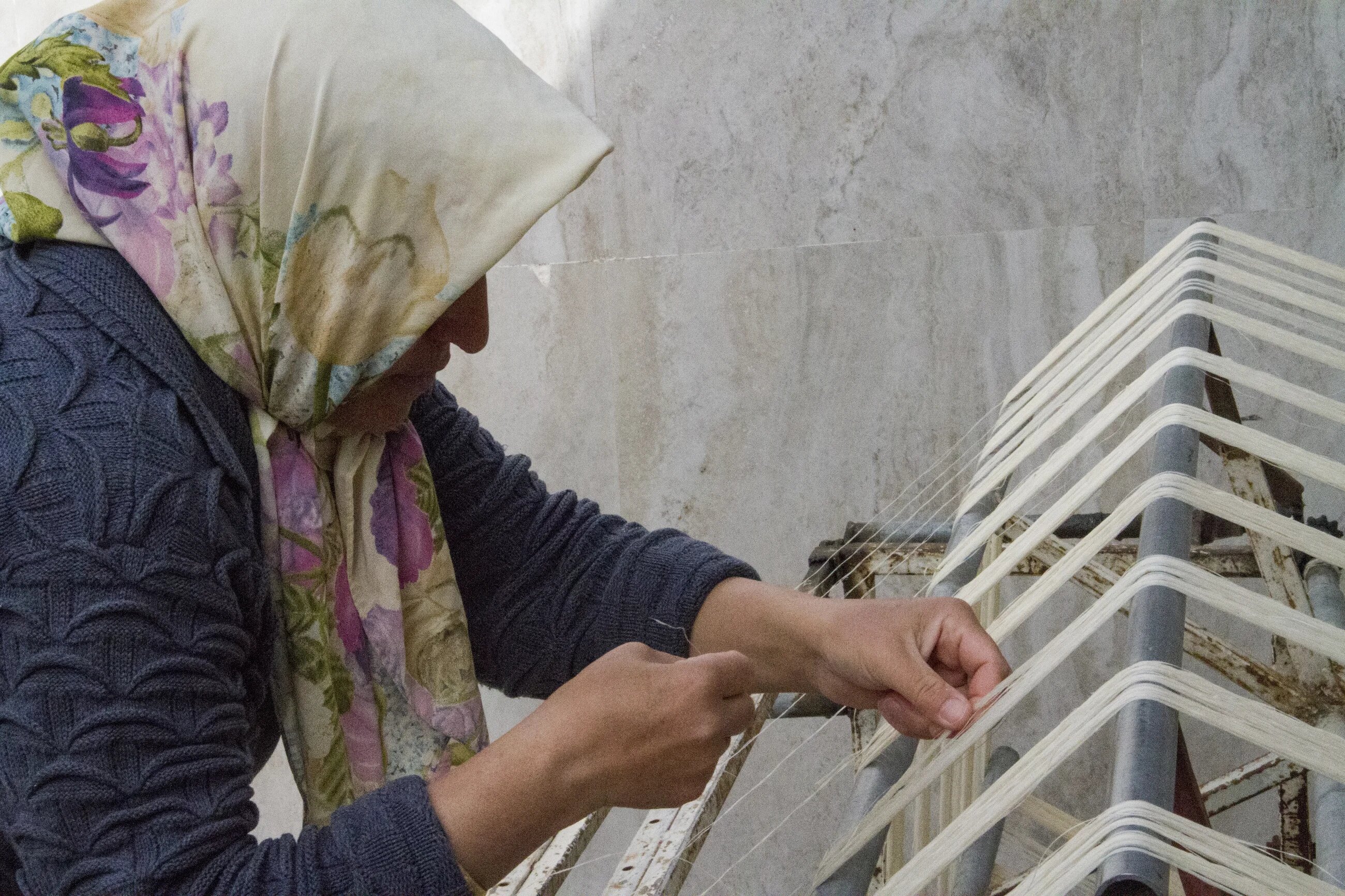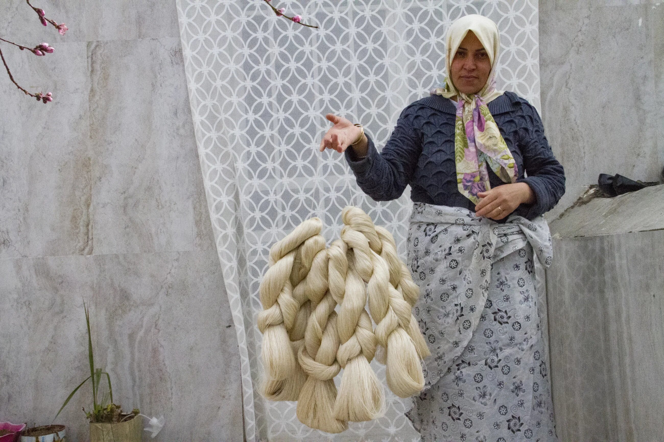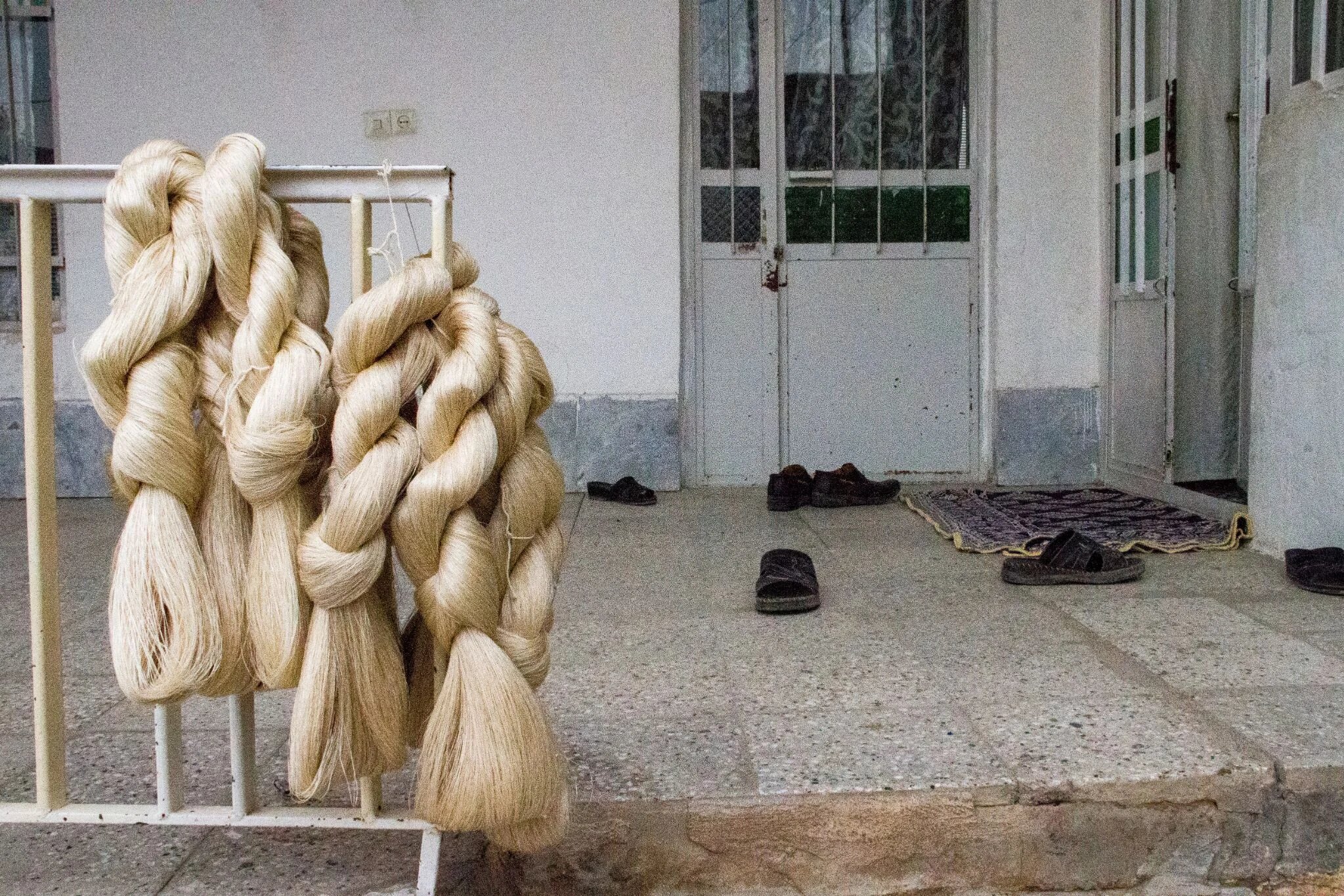 These bundles of finished silk thread, held in Mohammadi's wife's hands, are the product of around a week's work. Every month, the silk traders come to the village and collect the silk threads which are now ready to be steam dyed.