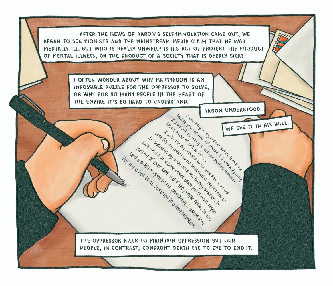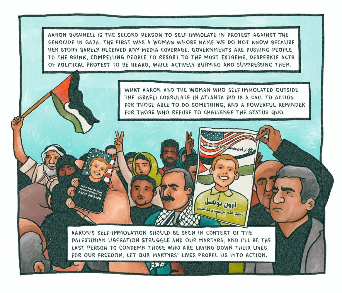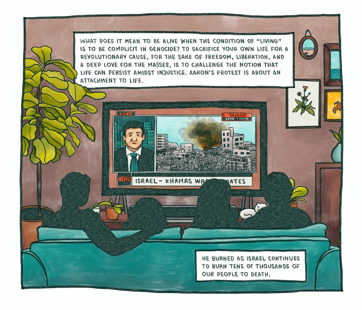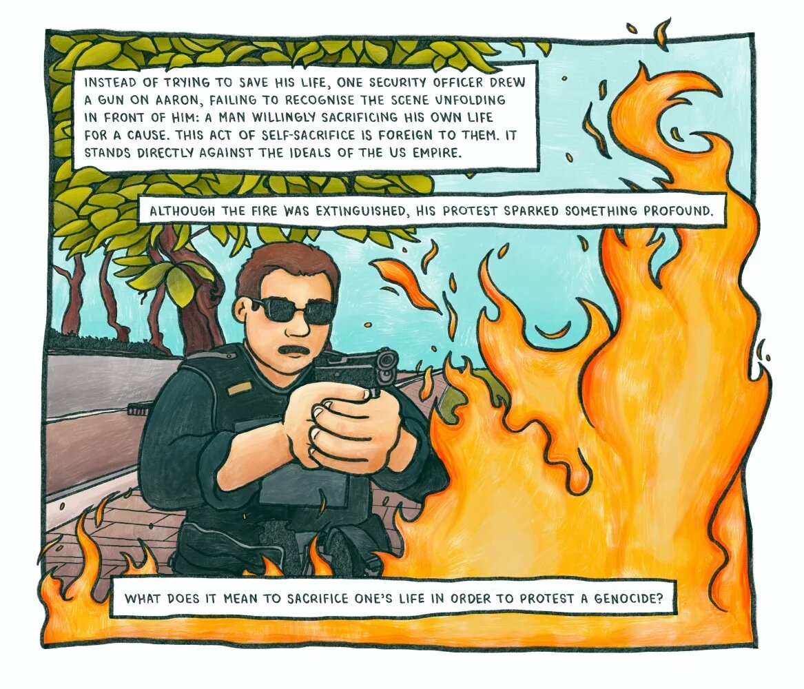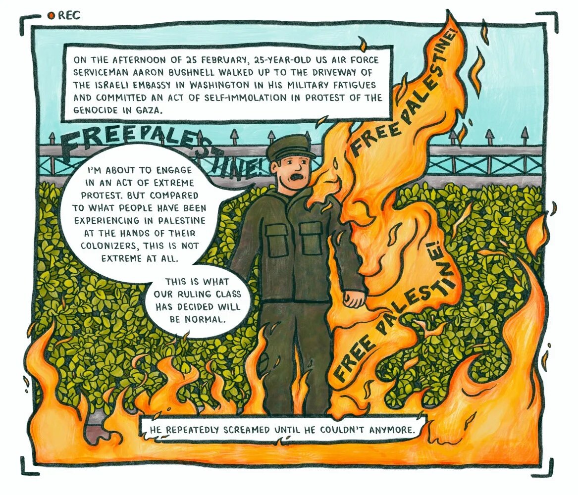 Illustrator Aya Ghanameh looks at the death of the US soldier who set himself on fire to protest his country's complicity in the genocide of Palestinians in Gaza