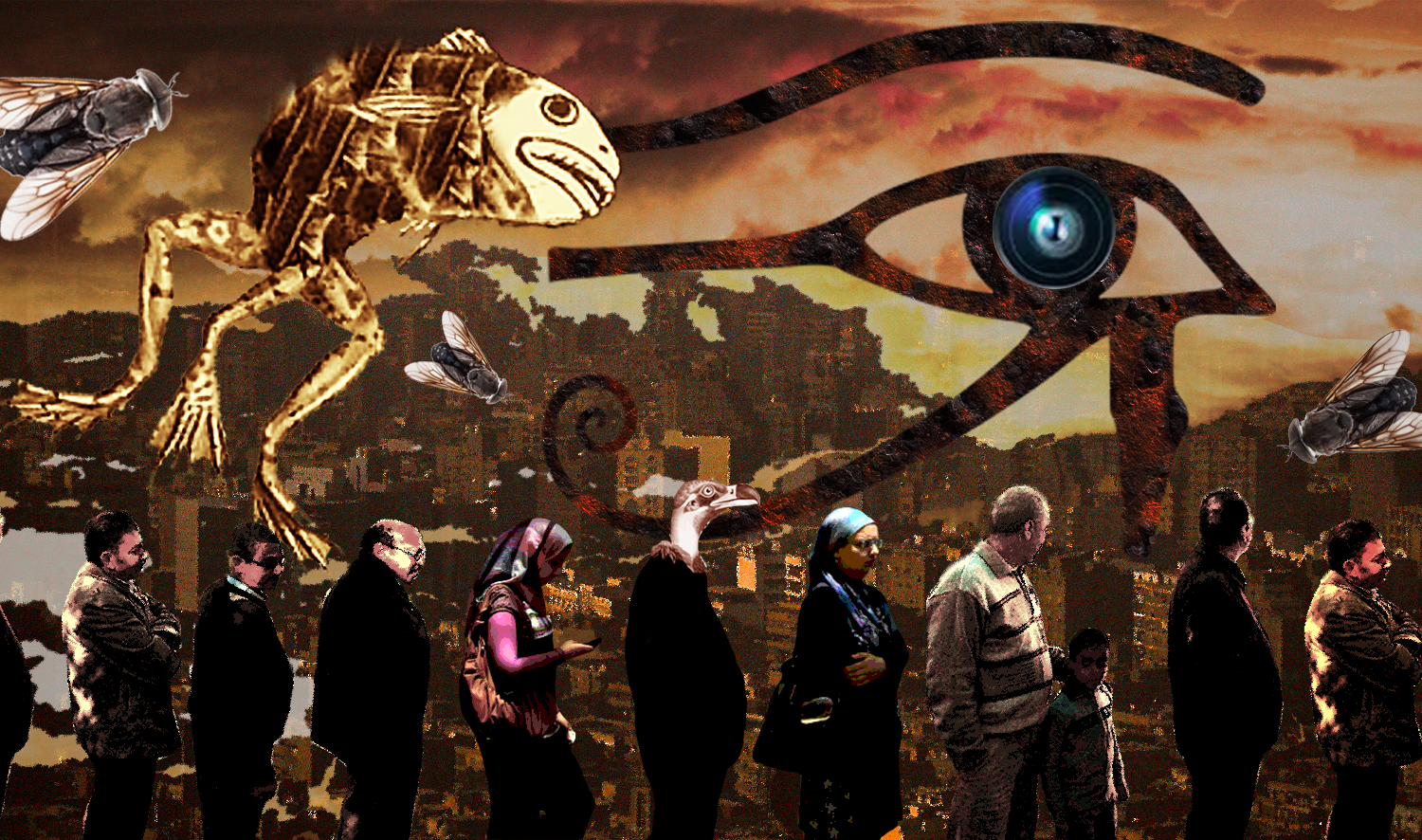 A collage inspired by novels about Egypt, including Using Life, Otared, The Second War of the Dog and The Queue (illustration Aaya al-Shamahi)