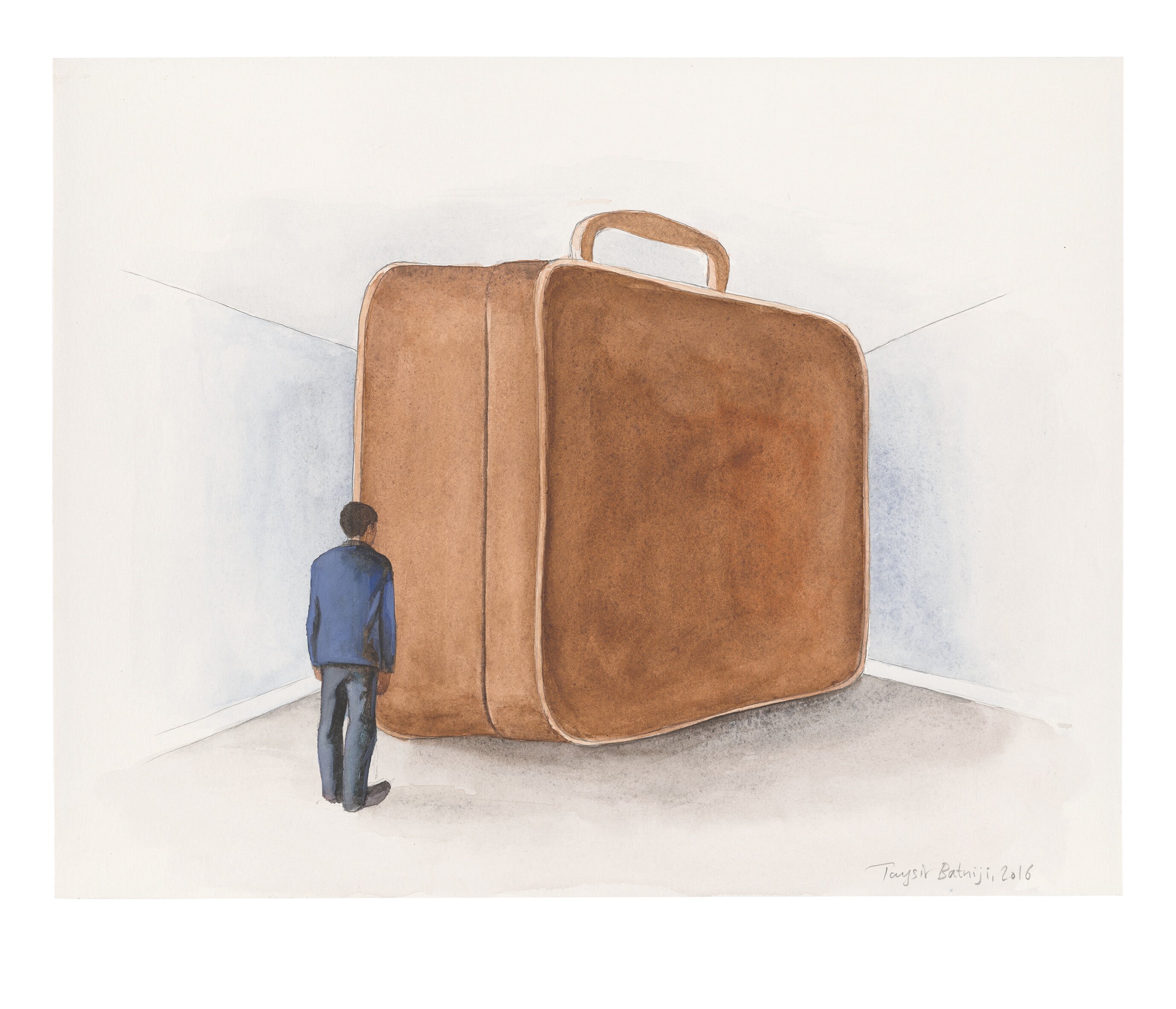 The focus of Gaza-born Palestinian artist Taysir Batniji’s work is exile and displacement. He last visited Gaza in 2012 and has been unable to return; in travel documents, he has seen his nationality stamped “undefined”. The artwork in the top image, in aquarelle on paper, perhaps shows the figure of the artist himself, contemplating life in a suitcase (Reproduced by permission of the artists, Djamel Tatah and Taysir Batniji)