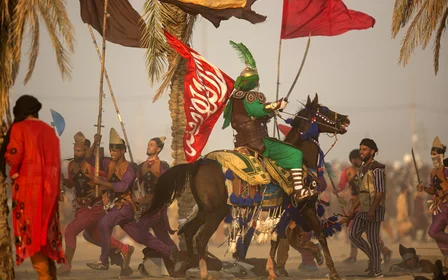 Mourning over the death of Imam Hussein starts at the beginning of Muharram, building up to a crescendo on the 10th day. In this picture, worshippers gather for a collective prayer in Basra, some 500km from the site of the Battle of Karbala. The lead up to Ashura is marked with processions and passion plays reenacting Hussein's death and the battle itself.
