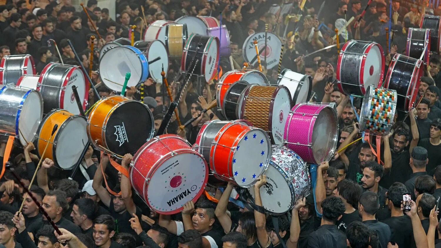 Worshippers in the Iraqi city of Najaf play drums during a procession marking the Battle of Karbala and the death of Imam Hussein.