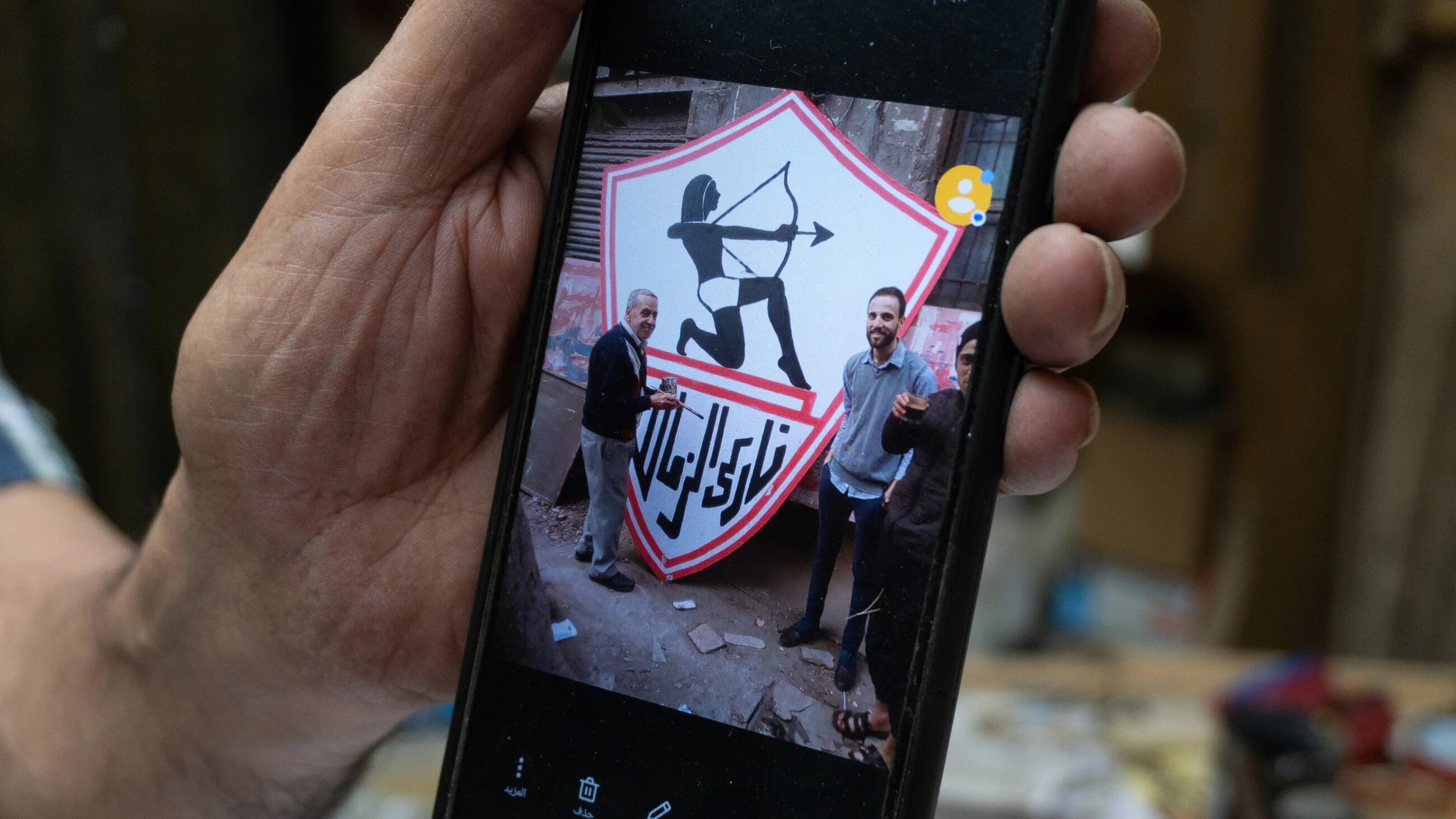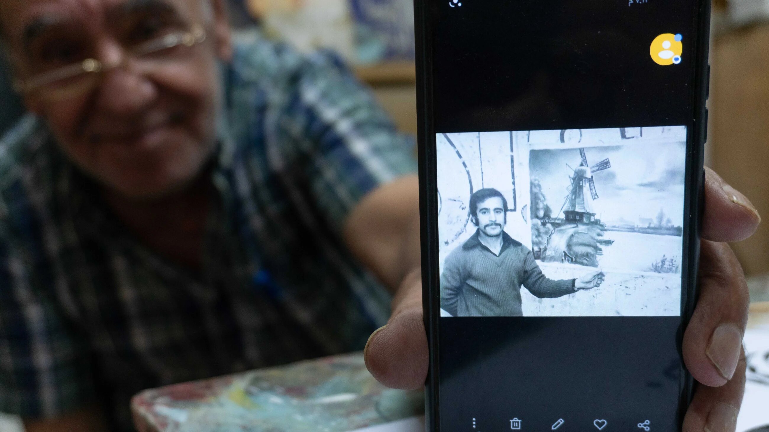 Years passed, and Nagi's artistic reputation got stronger. In 1975, he decided to set up a business of his own by opening up a modest workshop in the Al Sayeda Zeinab neighbourhood of Cairo. The image on the mobile phone is of a younger Nagi alongside one of his paintings.
