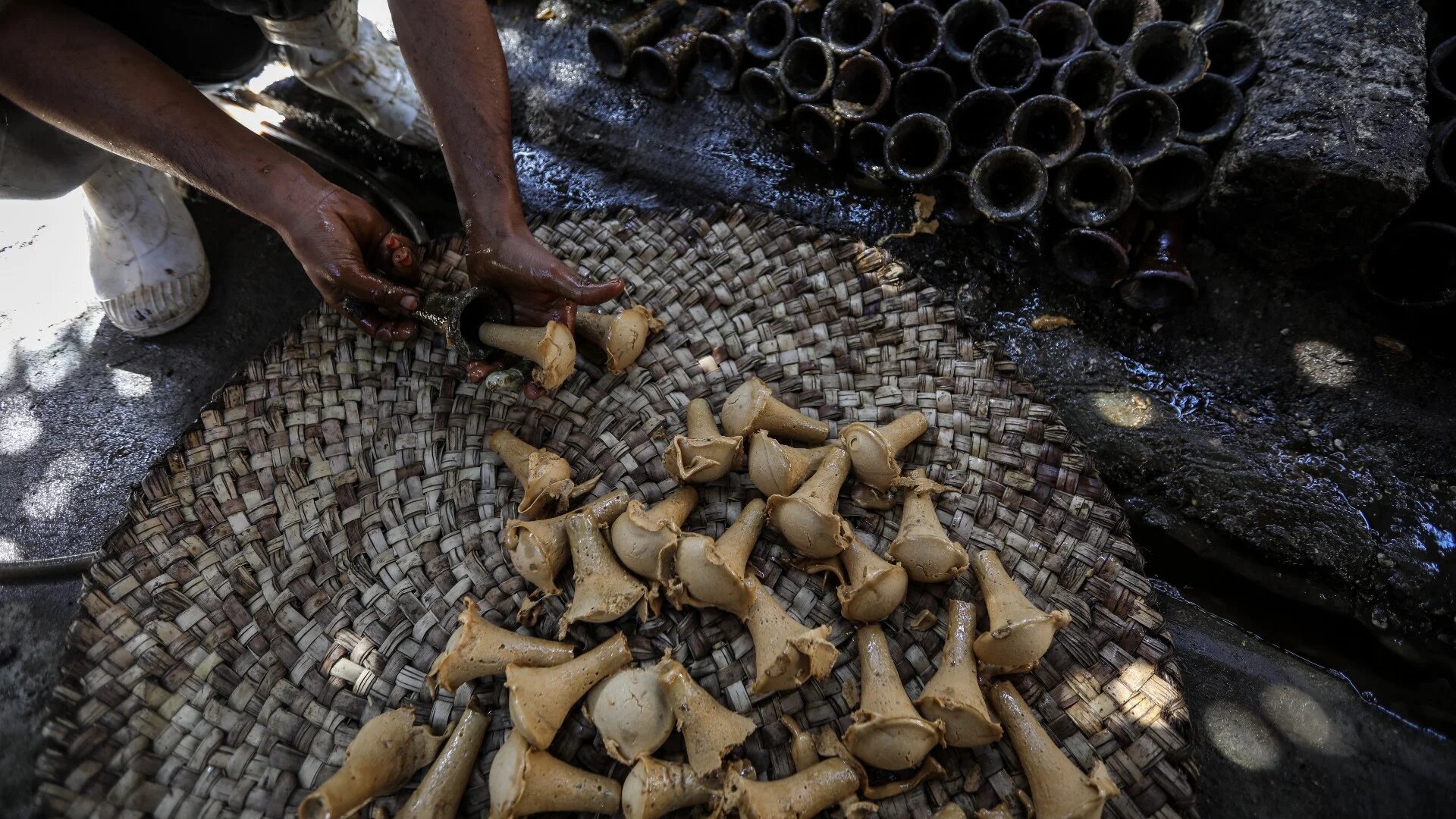 To make the sweet, first the syrup is collected and stored. According to workers at the factory, the liquid is then purified by boiling it for around 15 minutes, while being continuously stirred with a wooden stick. The syrup is then placed in a copper pan and left to boil again at a high temperature until it becomes completely liquidised, with sodium carbonate added to it. The mixture then takes on its harder texture when it cools.