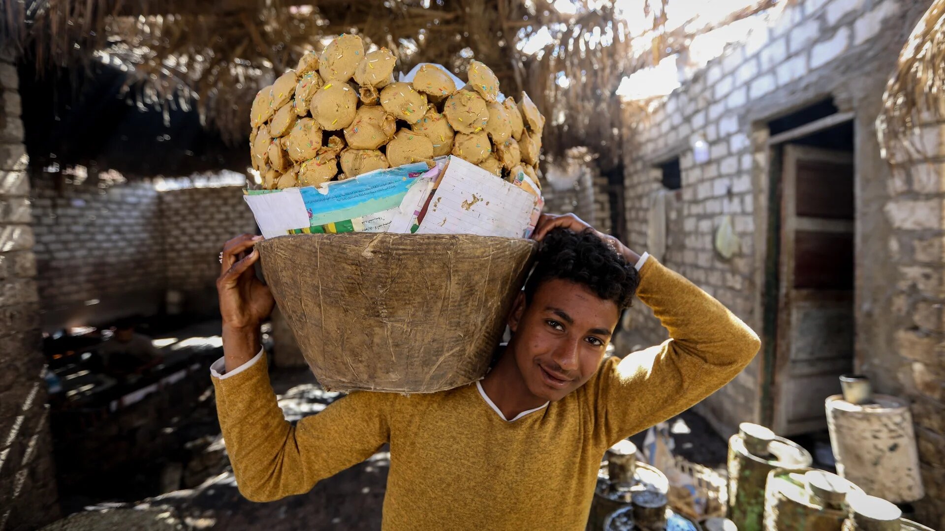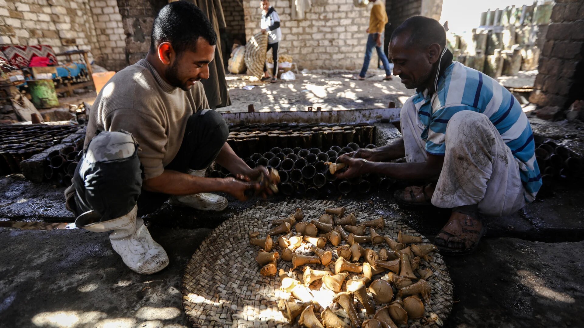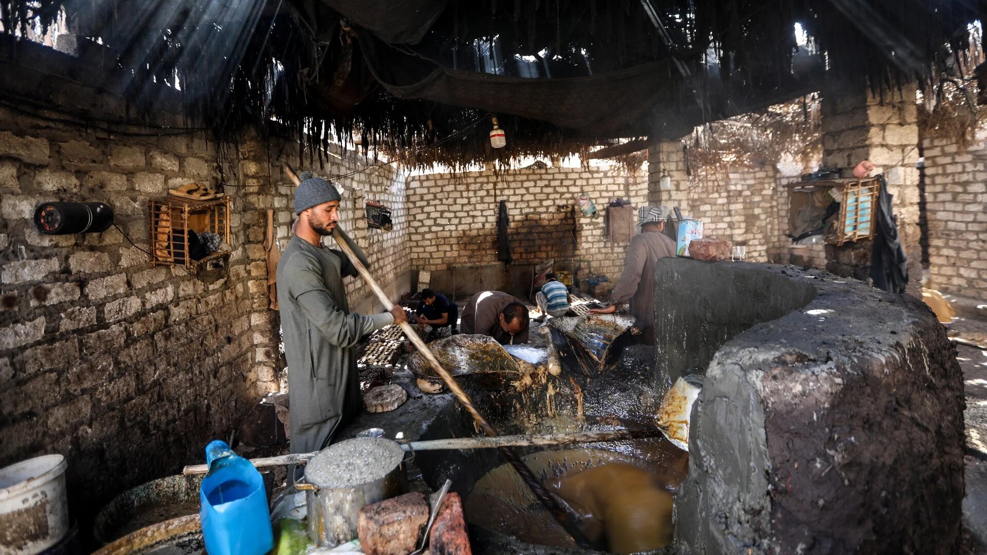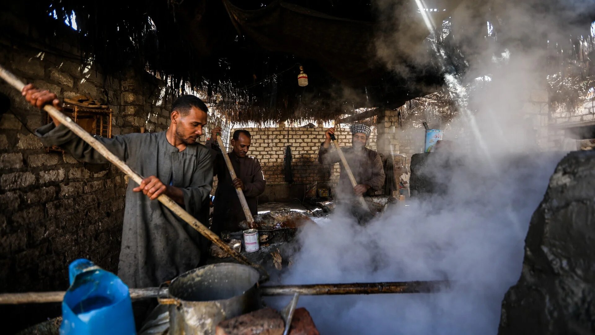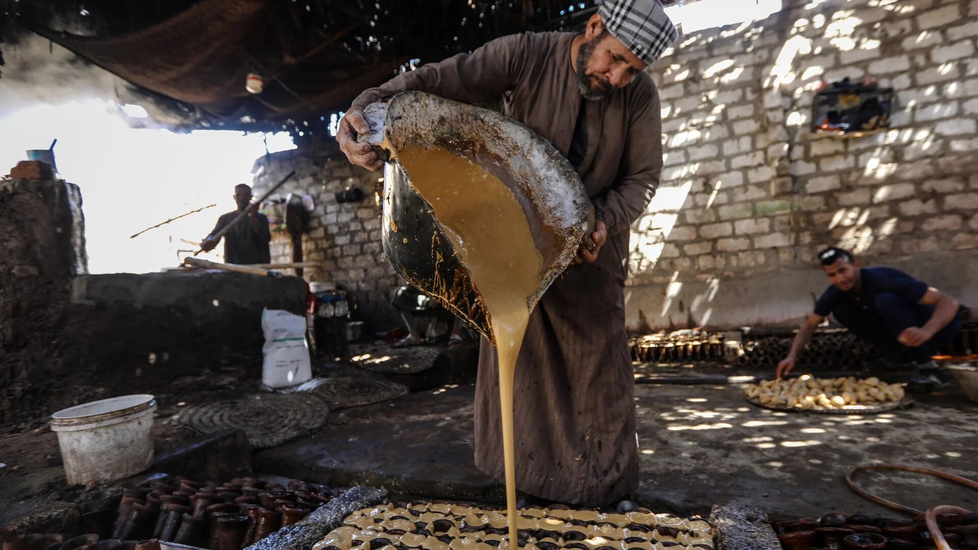 The factories in which jallab is produced are small brick buildings with straw ceilings. That composition allows sunlight to pour in from between the leaves and stems of the straws, offering shade for the workers. Inside, men hunch over large pots stirring. The sweet is still made by hand, as it has been for centuries, and does not use any modern machinery.