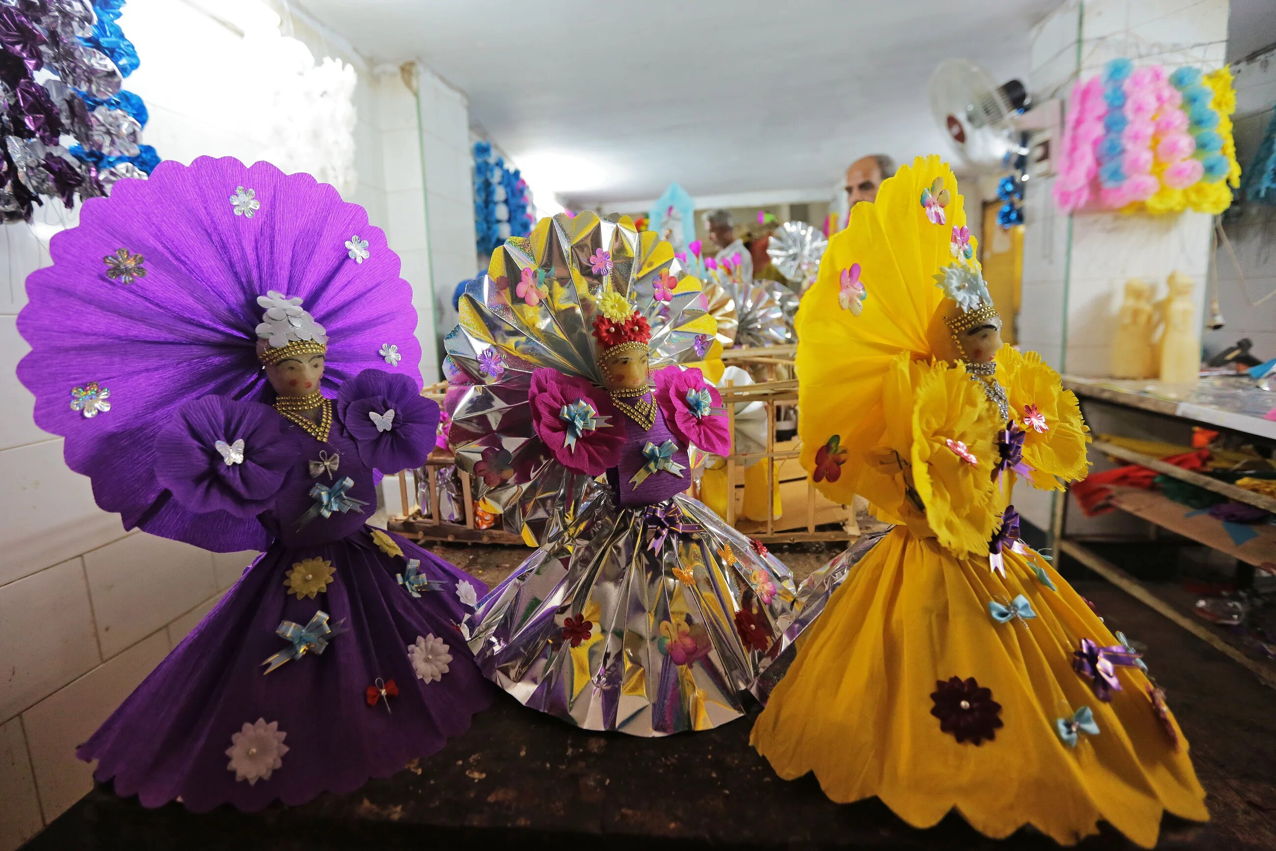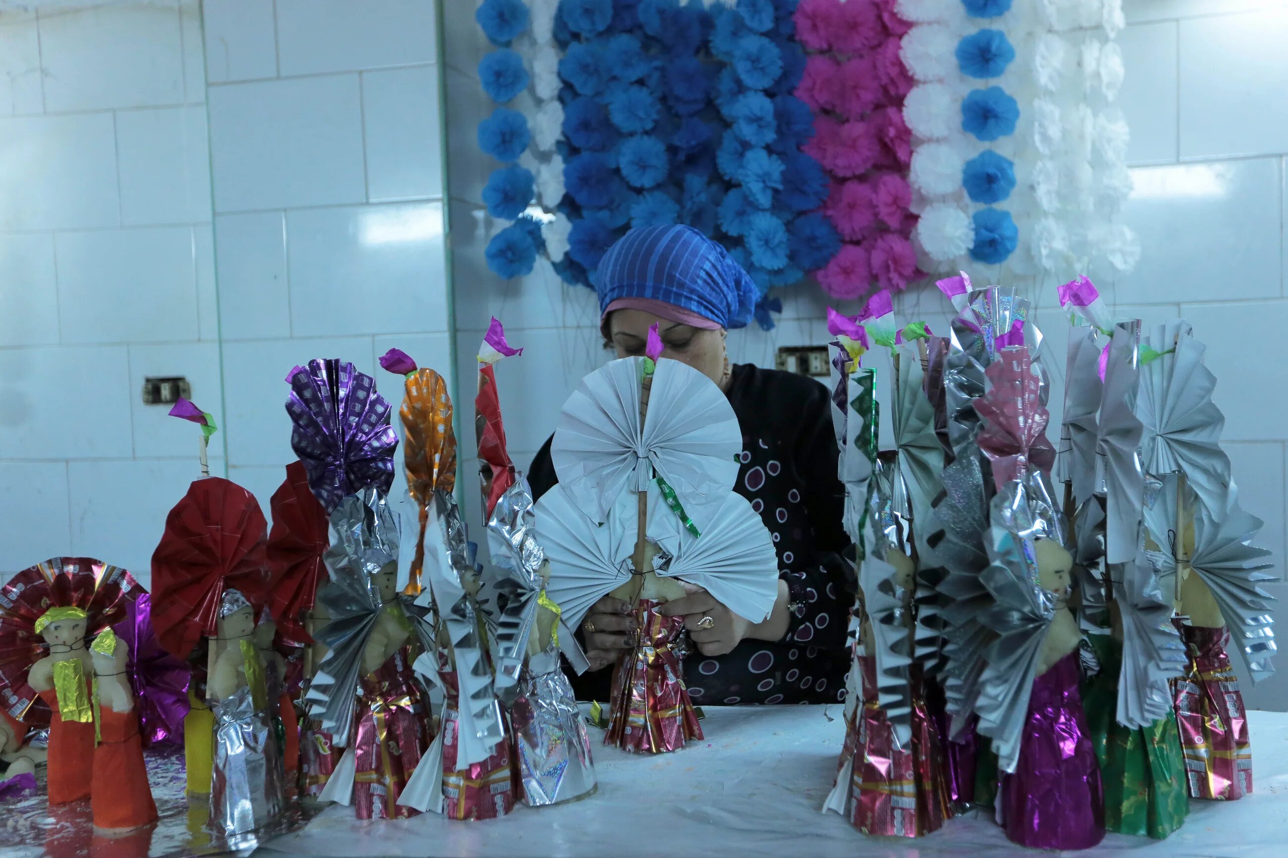 Once the sweets solidify in the mould, they are removed and decorated with colourful sheets of paper that are folded into designs.