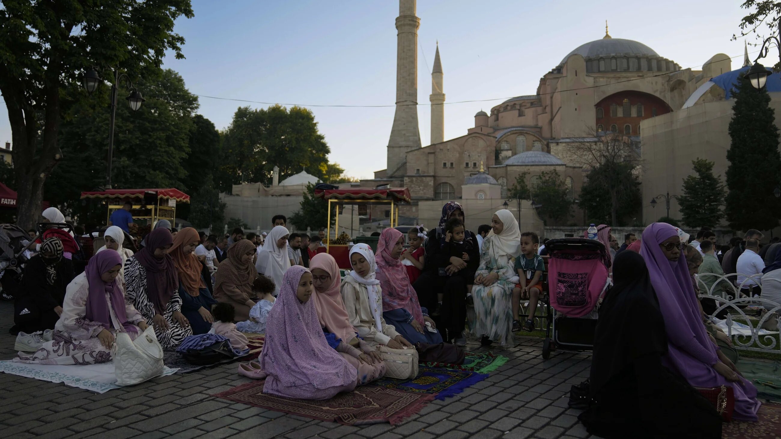 The Eid prayer is by far the most widely attended Islamic ritual of the year and mosques often struggle to accommodate worshippers within their walls. In Muslim-majority countries, it is common to see prayers spilling out onto the streets. In this image from Istanbul, Muslim women pray near the iconic Hagia Sophia mosque. (AP Photo/Khalil Hamra)