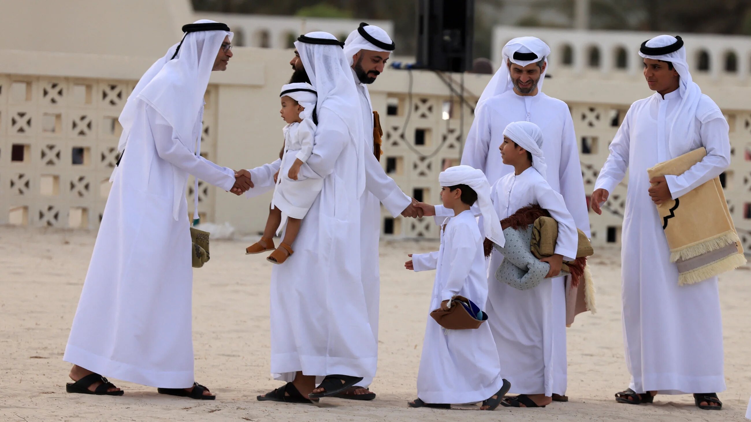 Emirati Muslims exchange wishes after Eid al-Adha morning prayers at Dubai's main mosque. (AFP photo/Karim Sahib)