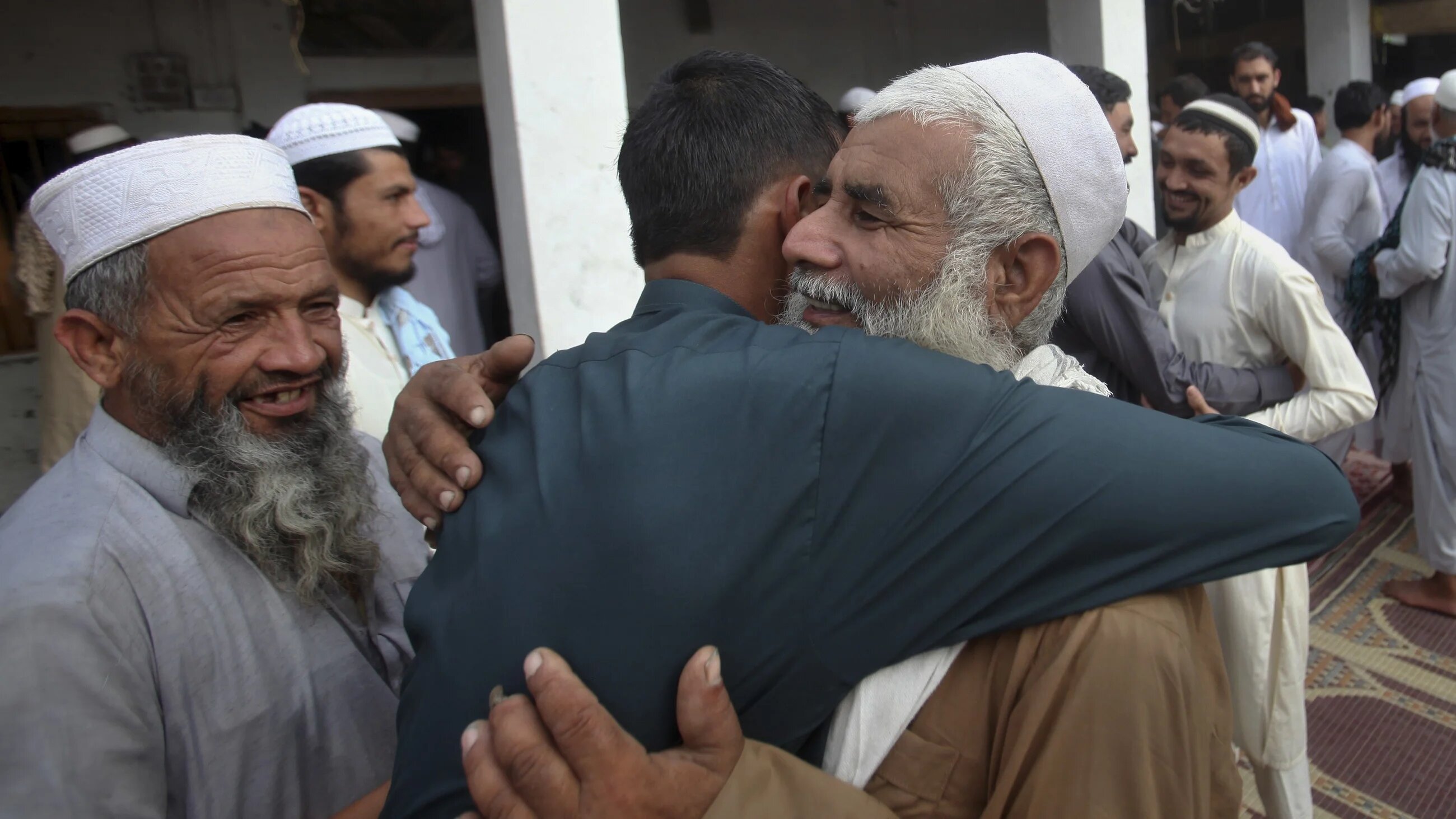 Another common tradition associated with Eid is the embracing of friends and relatives after the Eid prayer. As an official holiday in Muslim-majority states, which lasts several days in many instances, Eid is a time when Muslims visit relatives that they may not have seen in a long time. It is common for extended families to hold large feasts on the occasion. Here, Afghan refugees share Eid al-Adha greetings after attending a prayer at a mosque in the Kazana refugee camp on the outskirts of the Pakistani city of Peshawar. (AP Photo/Muhammad Sajjad)