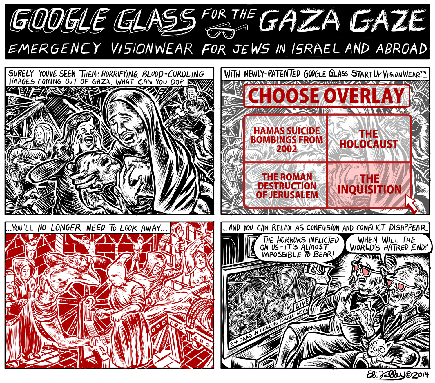 In another reference to the vicious attacks on Gaza and touted indifference of Israeli and American Jews, Valley invents “emergency vision wear for Jews in Israel and abroad” that distorts the images from Gaza, replacing the mayhem with images that reflect historical Jewish trauma instead.