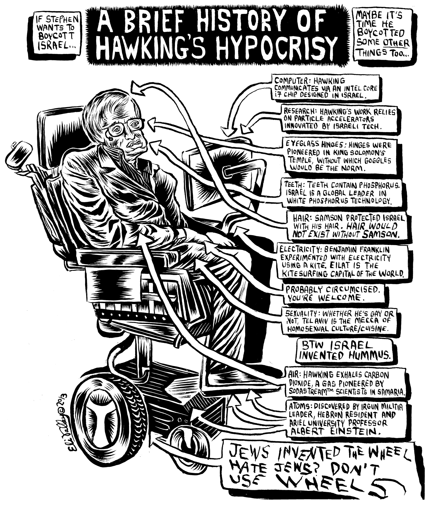 Stephen Hawking was a frequent critic of Israel: here Valley satirises Israeli views on the scientist (Eli Valley)