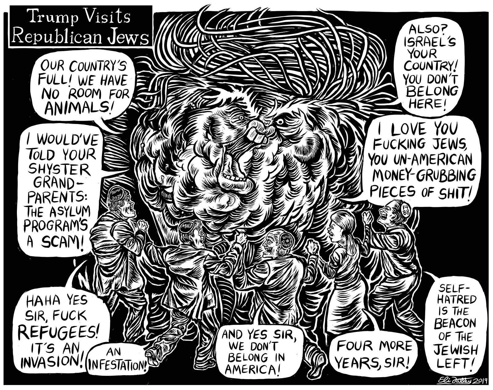 Only an Eli Valley comic could have ably illustrated this implausible alliance between Trump, his right-wing Christian cohorts in the Republican Party and right-wing American Jews with the right amount of psychotic bile, I think to myself.