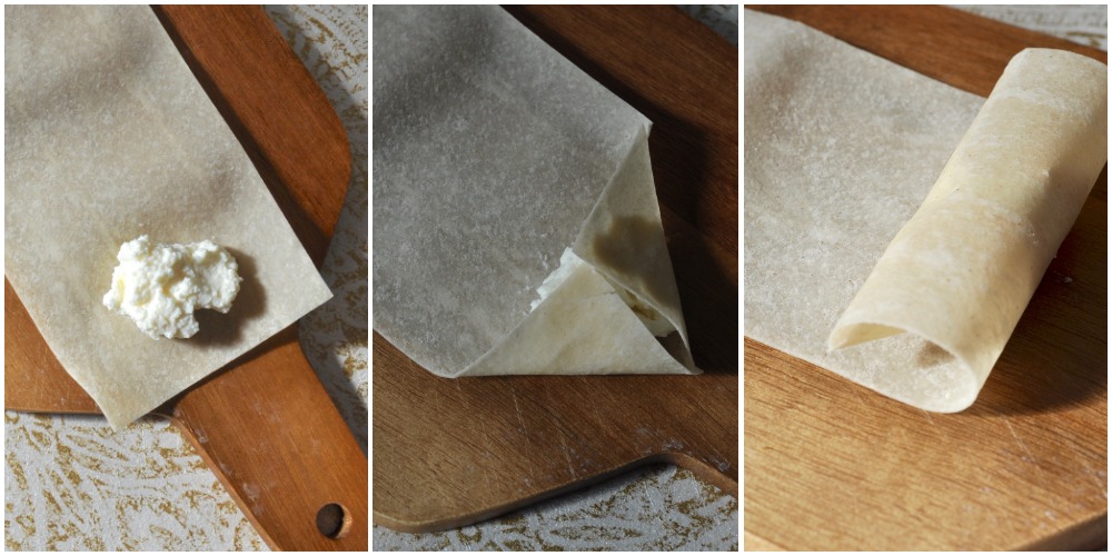 - Take one sheet of pastry and place about ¾ tsp of the cheese mixture at the bottom (leave a slight edge to grab the pastry).