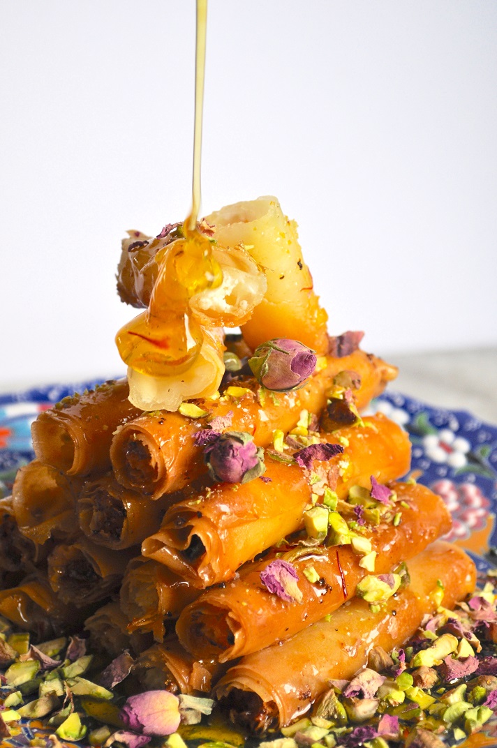 The best part about this recipe is that it lets you make both the syrup and the fingers in advance. The pastries will also last up to a month in the freezer: perfect throughout Ramadan so you can easily whip out just enough to fry each evening. The syrup will also keep for up to two weeks if stored in an air-tight glass container.