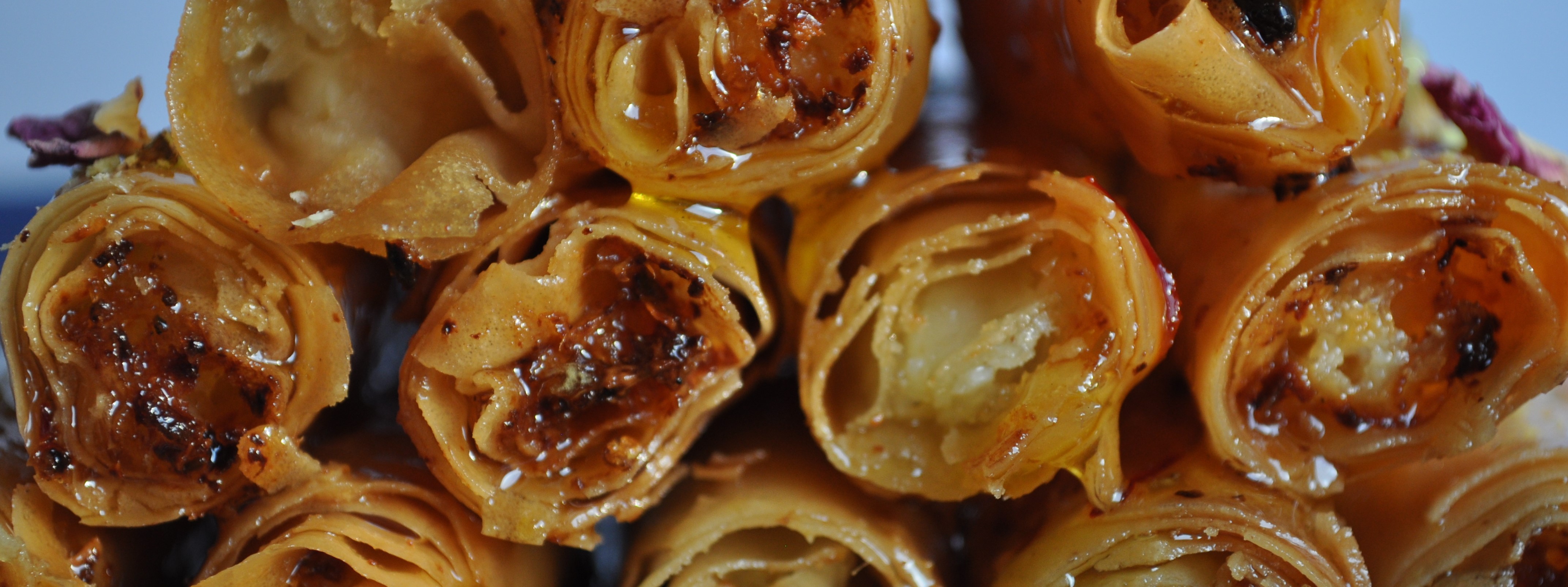 While some Levantine countries make their version with semolina and leave out the filling, in Oman we wrap a creamy-based cheese in filo pastry, deep fry it, then finish it off by soaking it in a rich saffron and cardamom syrup. Something similar is made in Palestine, where it goes by the great name of znoud el sit ("forearms of the lady").