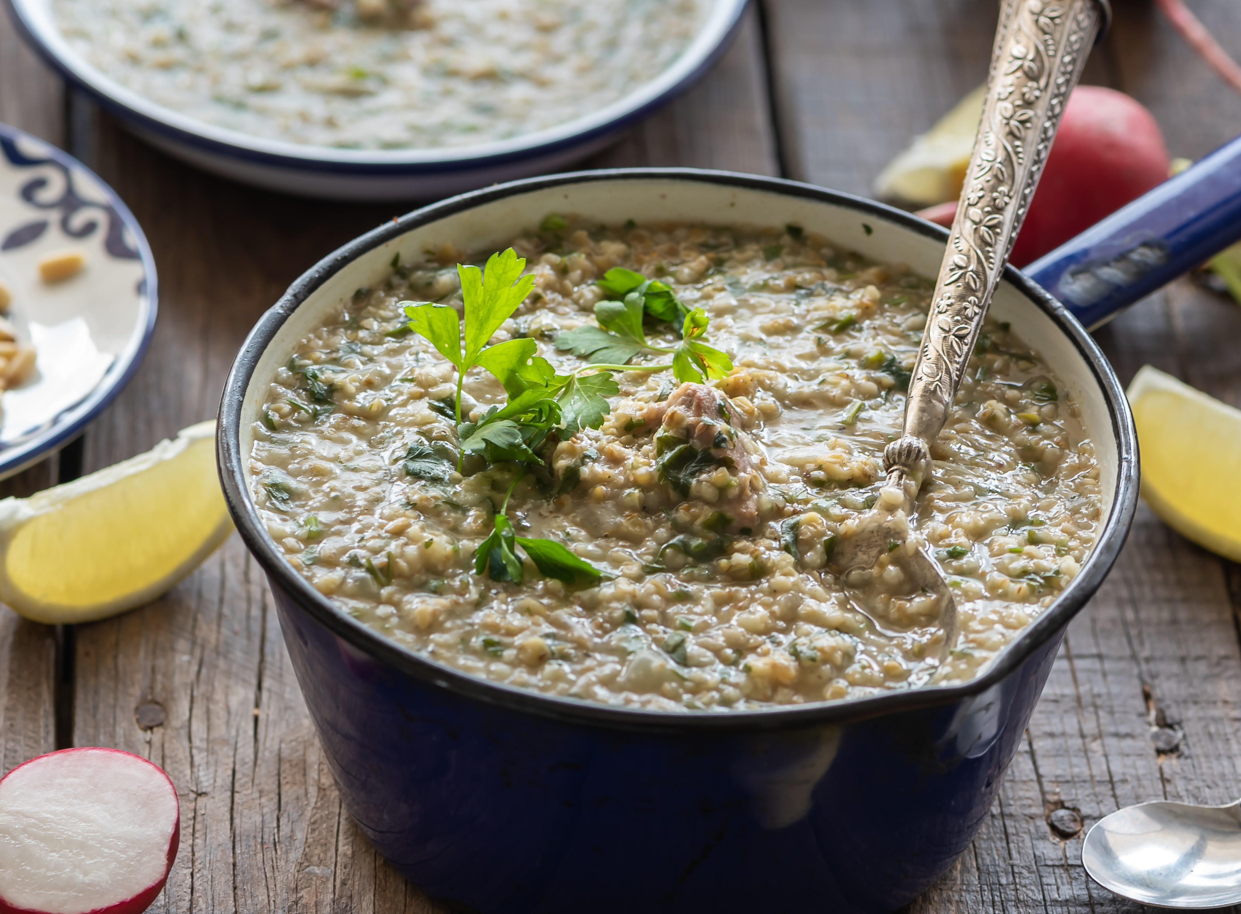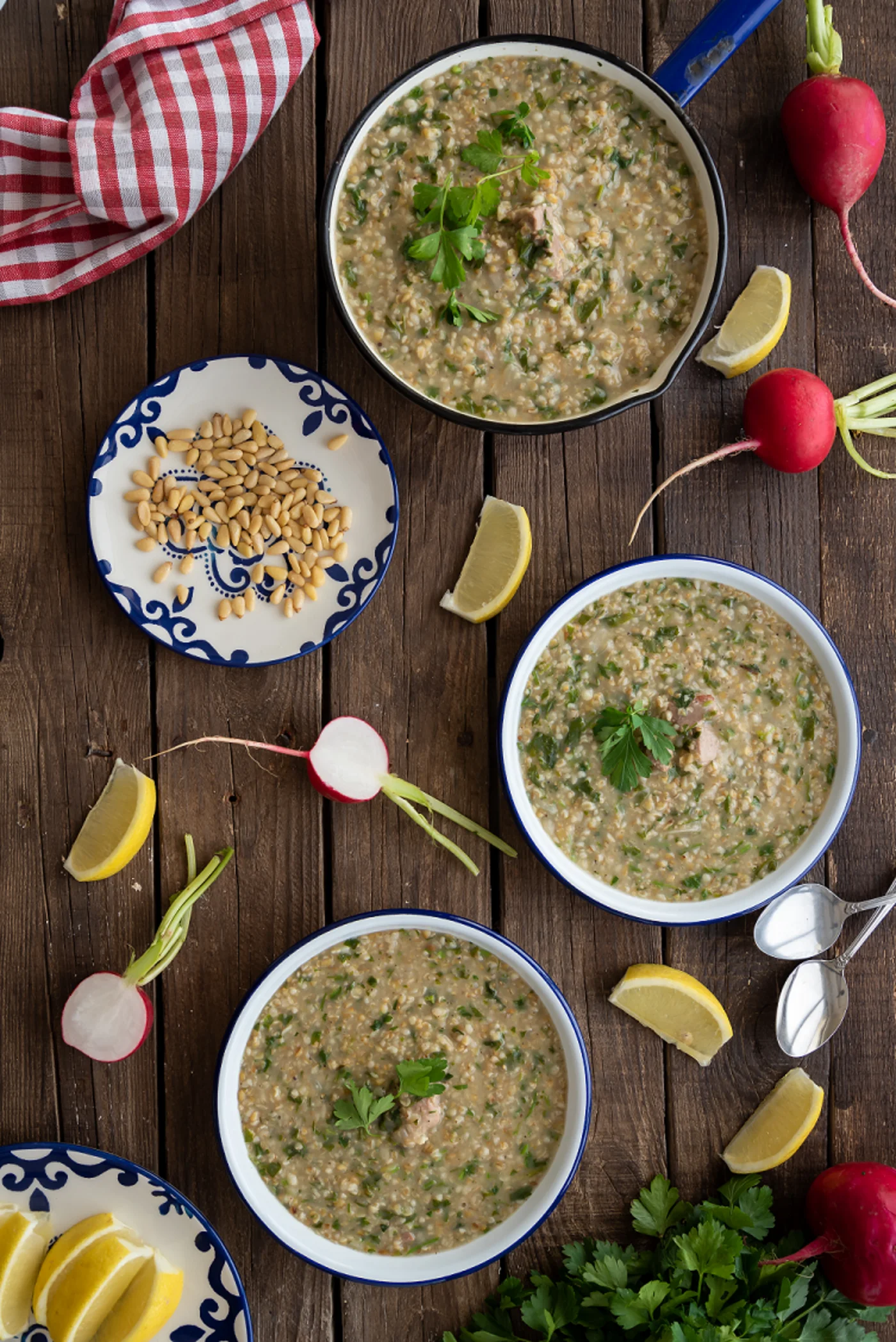 Legend has it that this dish originated thousands of years ago, when a village was besieged and the supply of raw, green wheat caught fire. The villagers cleverly discovered that they could save the grains by rubbing away the burnt parts to reveal the roasted wheat seeds inside.