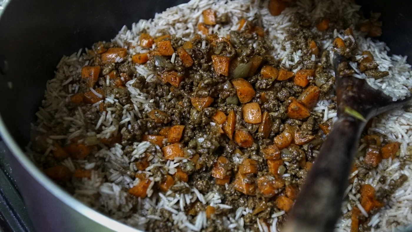 10. Once the rice is cooked, add the carrot-onion-mince mixture to the rice.