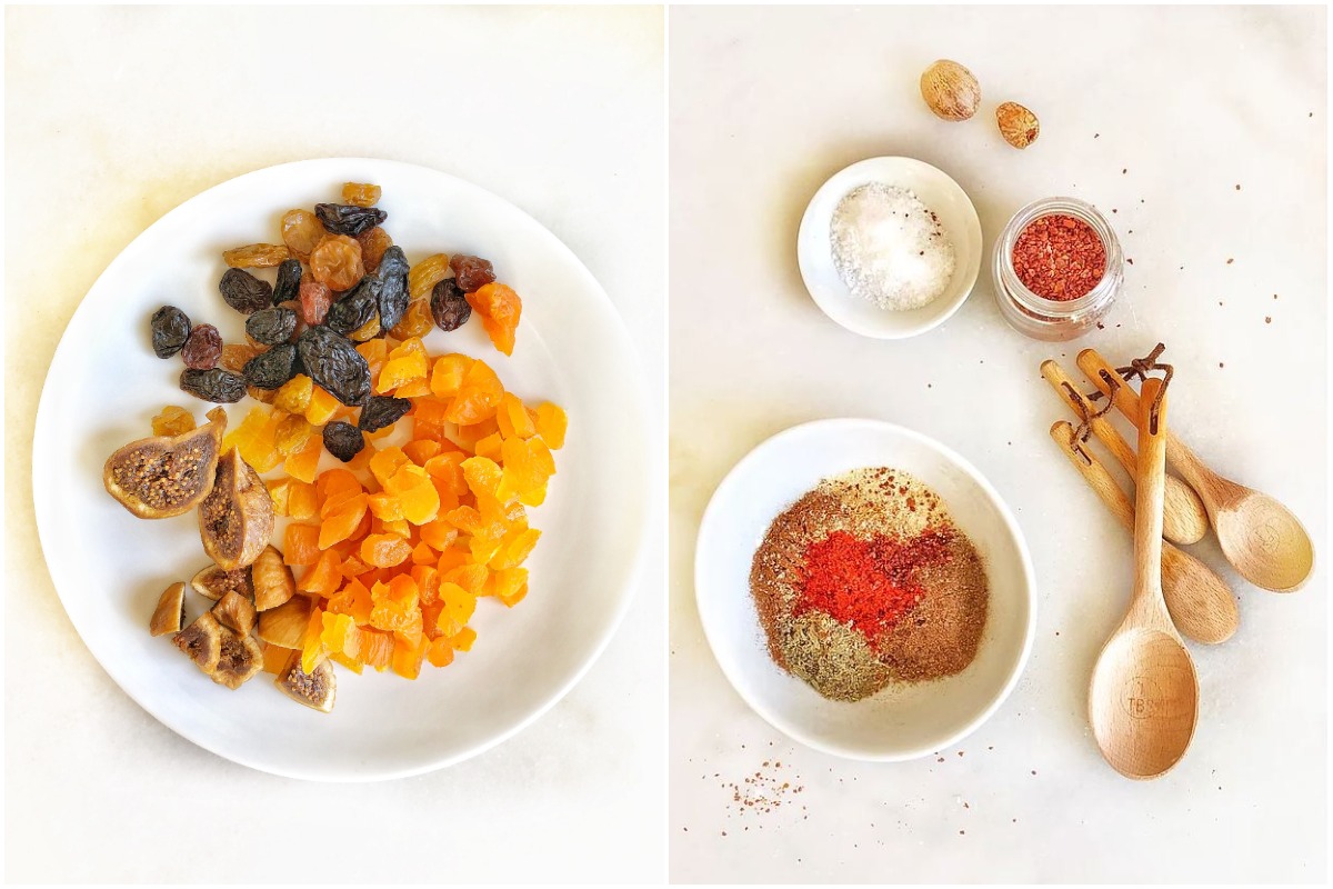 - 75g (½ cup) assorted dried fruits such as apricots, figs, and currants, chopped into bite-size pieces