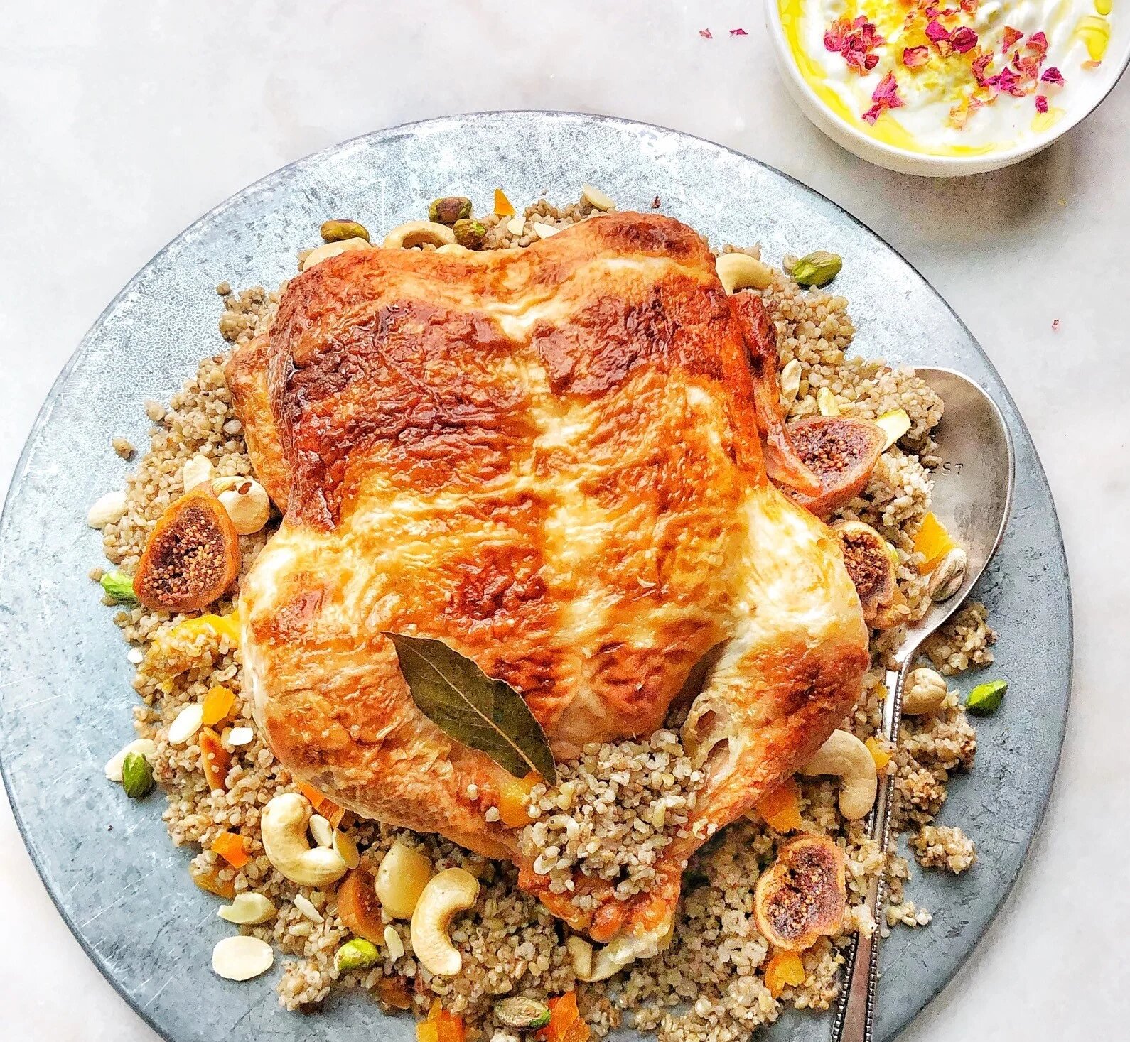 This version features chicken but can work with other cuts, such as a leg of lamb. Serve any of the leftover freekeh stuffing on the side or turn it into a salad for the following day.