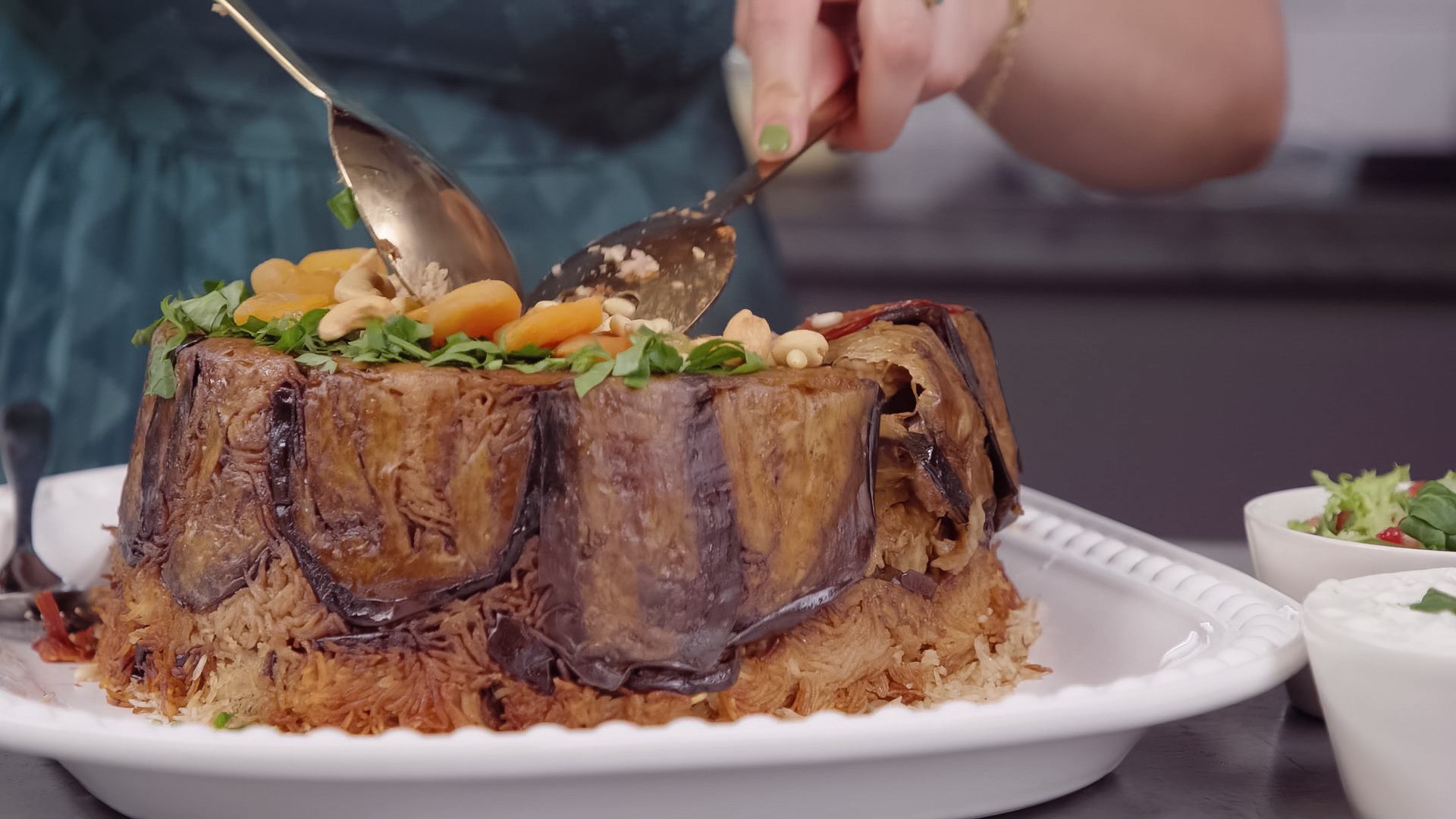 Think of it as a savoury upside-down cake with aromatic layers of aubergines, potatoes, rice and lamb. It's your one-stop pot with no right way of layering it. The only thing this calls for is a bit of arm strength for that ever-so-important flip!