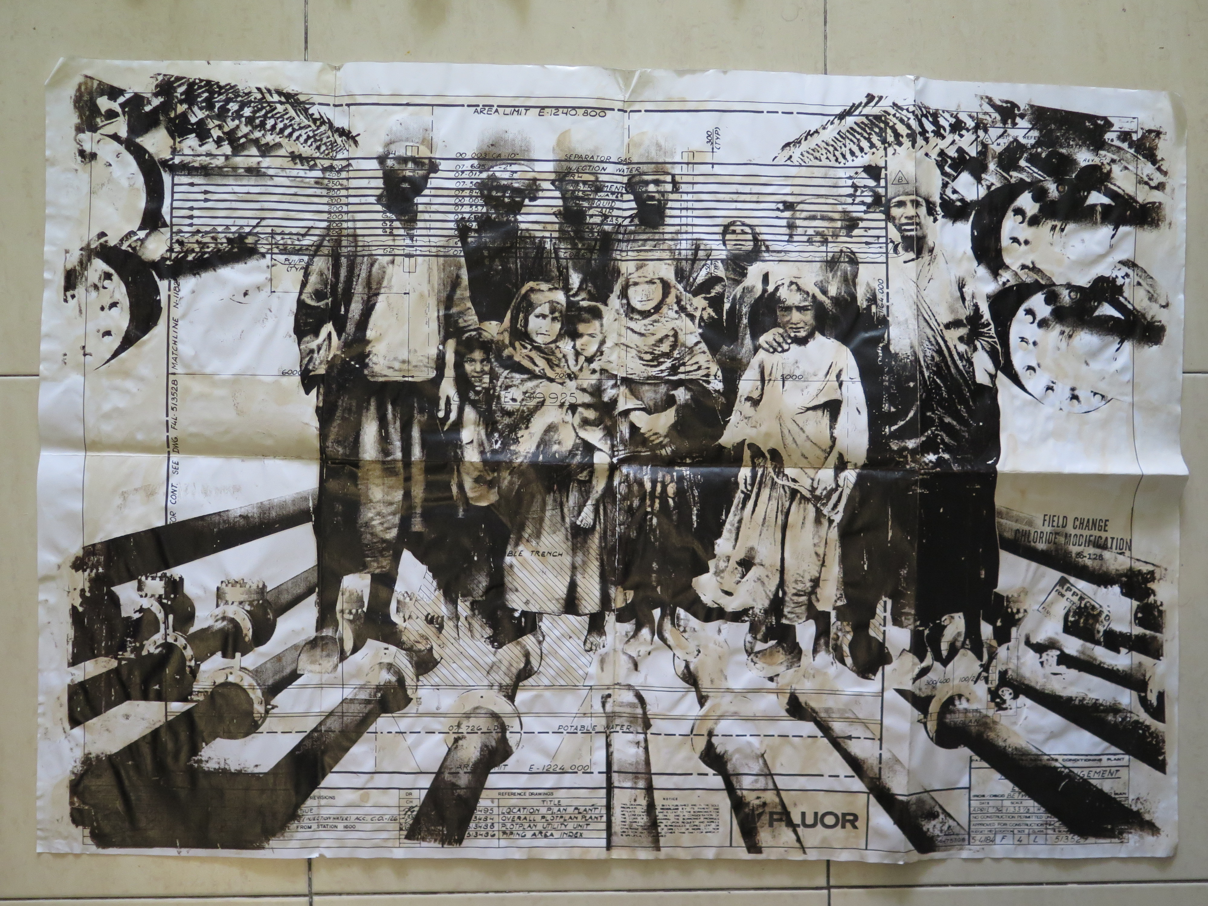 His use of vintage British maps and blueprints as his paper reflects the early British role in exploitation of the oil-rich land.