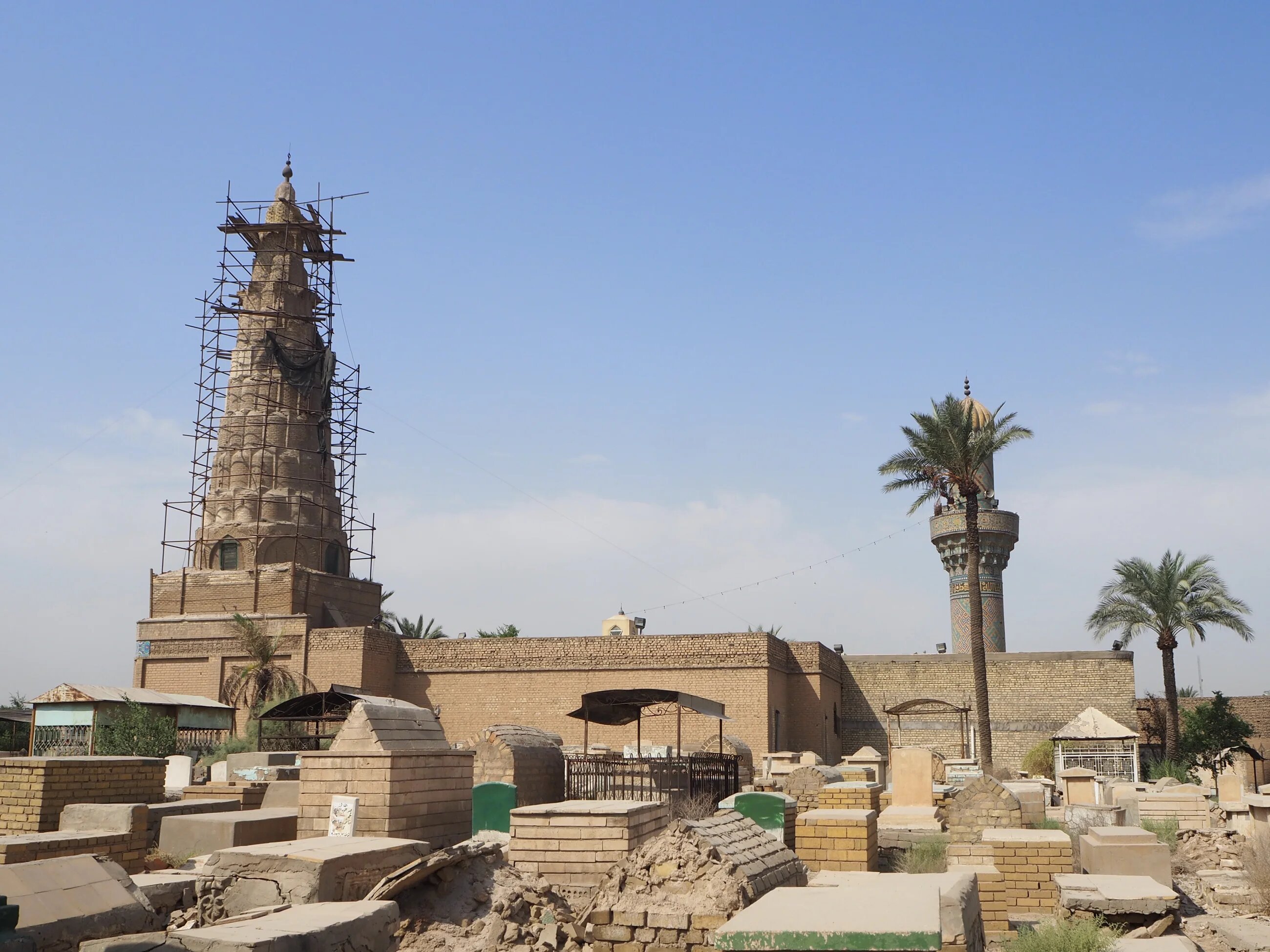 Across the city, nestled among date palms and Baghdad’s ancient city walls, is another key historic site, which is now surrounded by scaffolding. The mausoleum of Shihab al-Din Abu Hafs Umar Suhrawardi is one of the oldest in the city. The shrine has fallen victim to the corruption which was rife following the invasion of Iraq in 2003. The equivalent of $1m earmarked to repair the leaning tower was allegedly all spent after a few months’ work, which included erecting scaffolding and knocking a hole in the side of the tower to inject a product to prevent further leaning. “They worked for two or three months and then left, but you could demolish this and rebuild it from scratch for $1m,” the mosque’s Imam, Kamal Abd al-Mutalib Hashem, told Middle East Eye. “They came to make the tower straight, but they made a hole in it. This is not construction but destruction.”