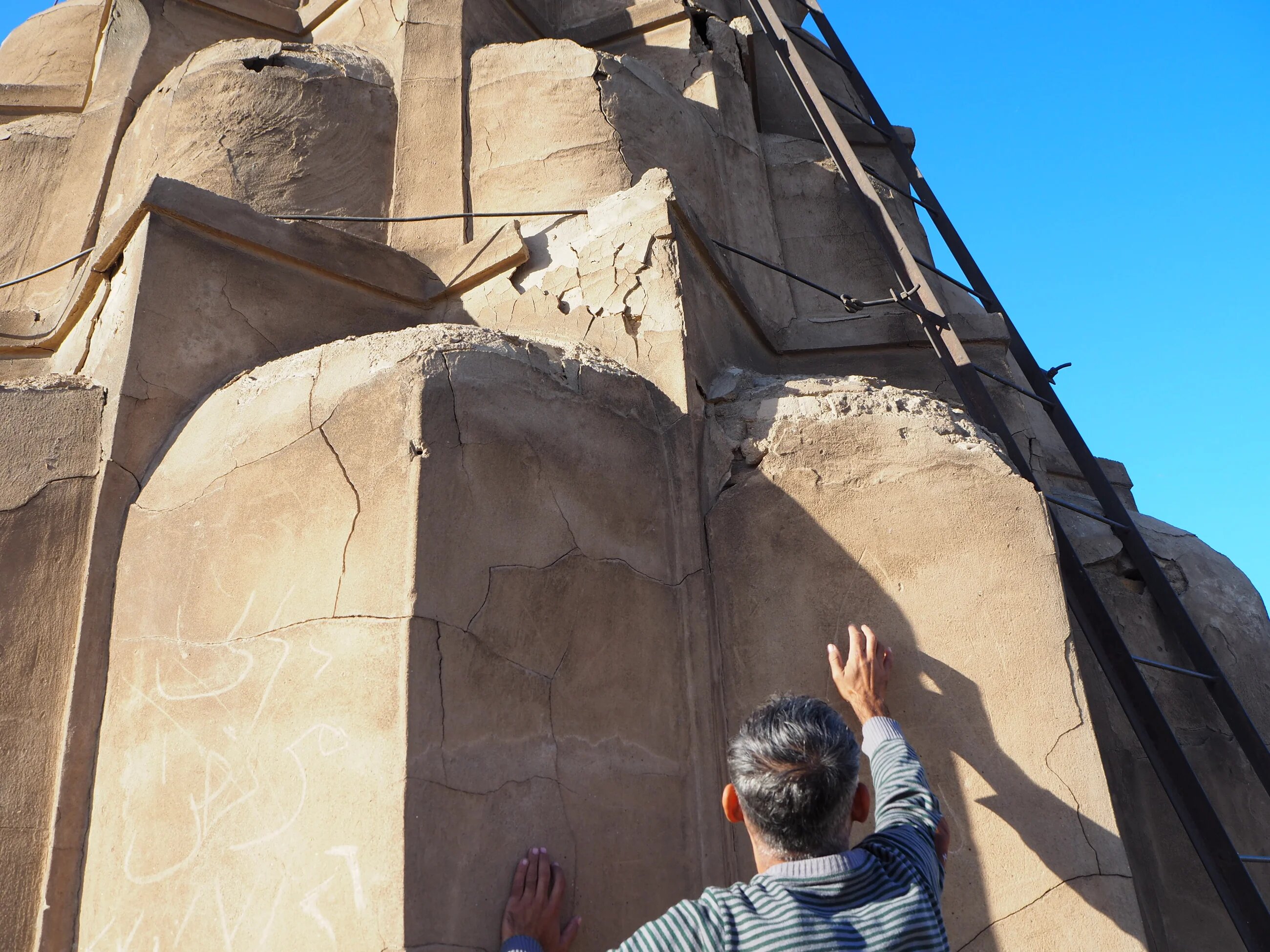 Although restoration efforts have been attempted over the years, with the last major renovation undertaken in 1972, the base of the tower has deteriorated. Today, visitors can see several iron bands circling the tower to support it, with visible cracks also showing on the plaster. According to Ibrahim, a star which used to top the minaret recently broke away, shattering into tiny pieces.