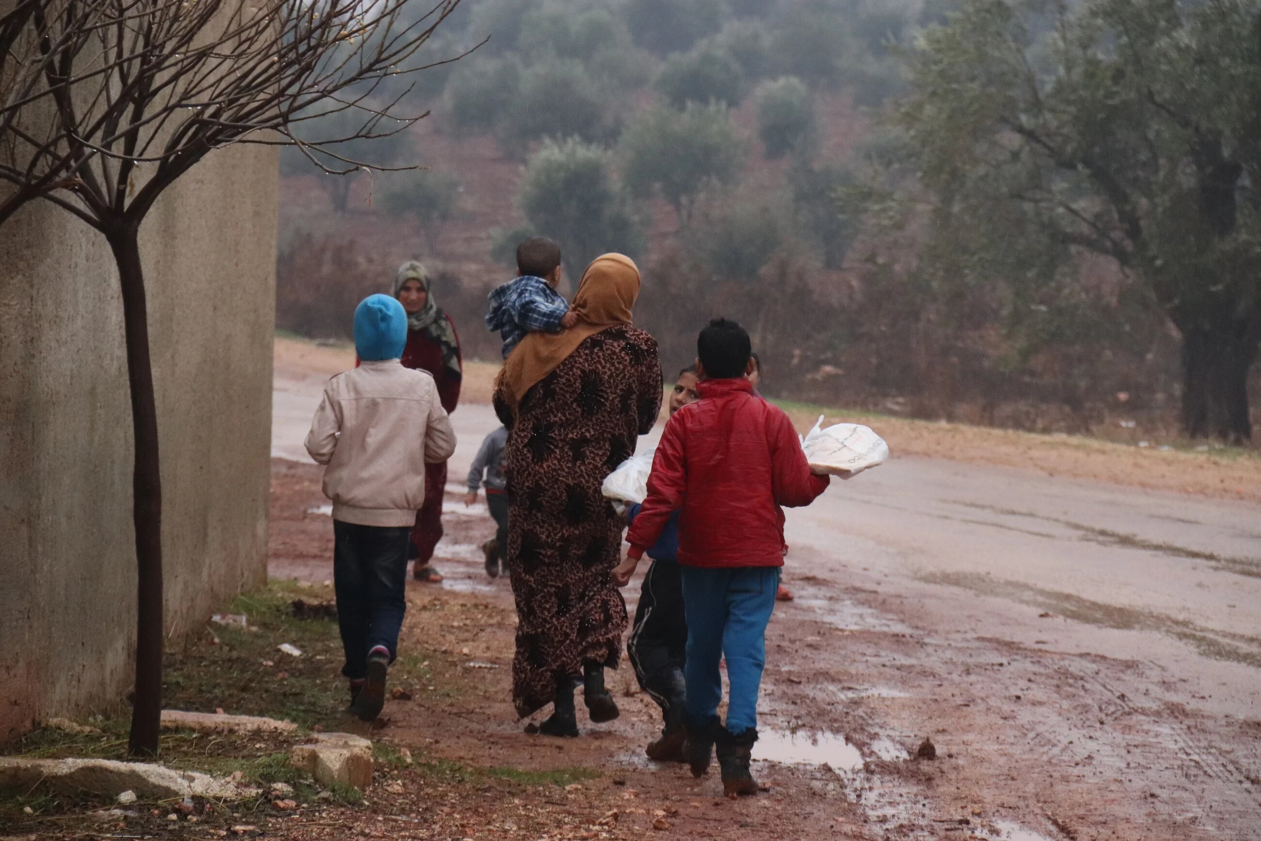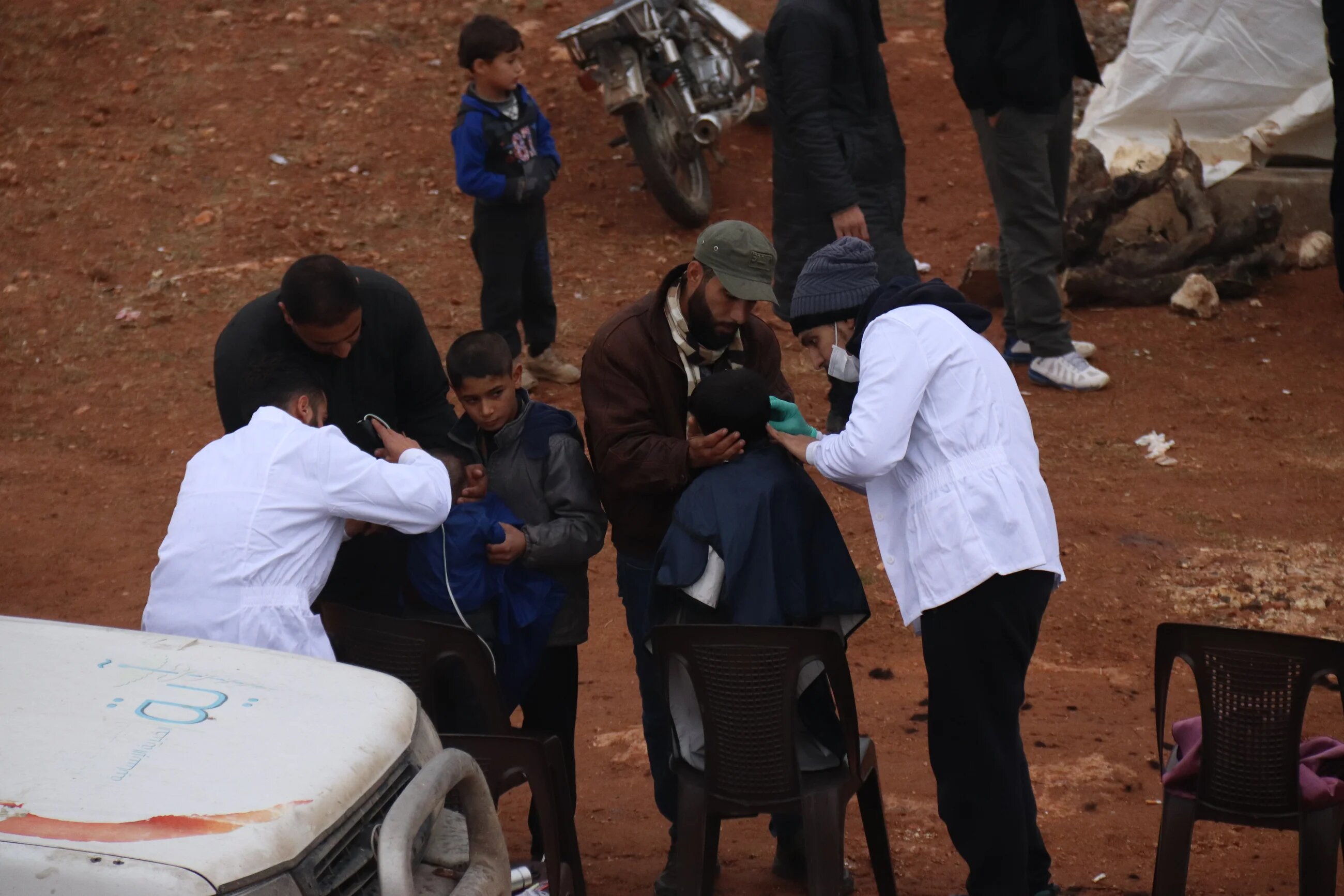 Displaced from his home by the war, Abdo decided five months ago to start an initiative: every weekend, he and other barbers would visit nearby displacement camps and cut children’s hair for free. In a red puffer jacket, Abdo watches over his colleagues as they trim the hair of boys in a camp on 9 December (MEE/Muhammad Al Hosse)