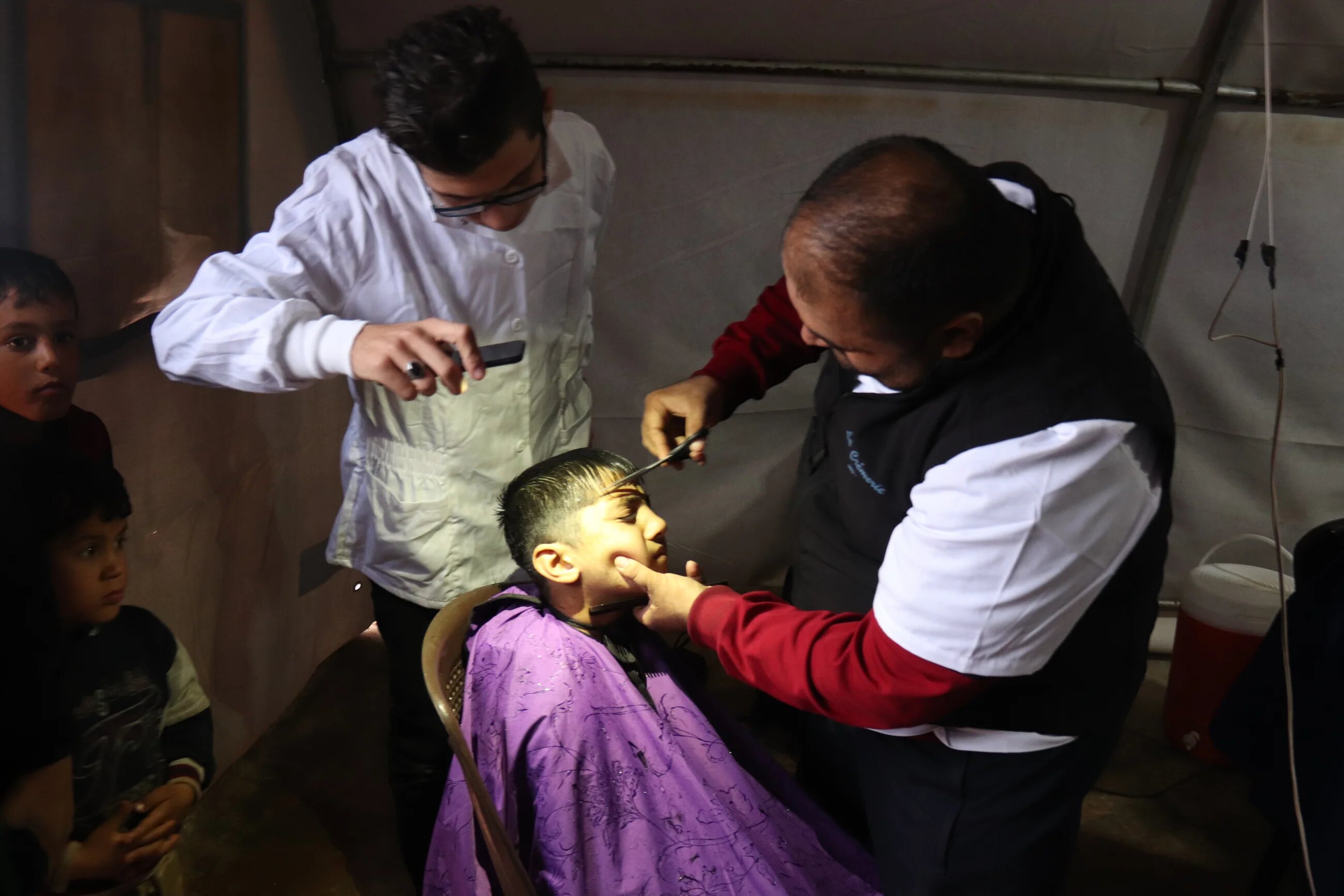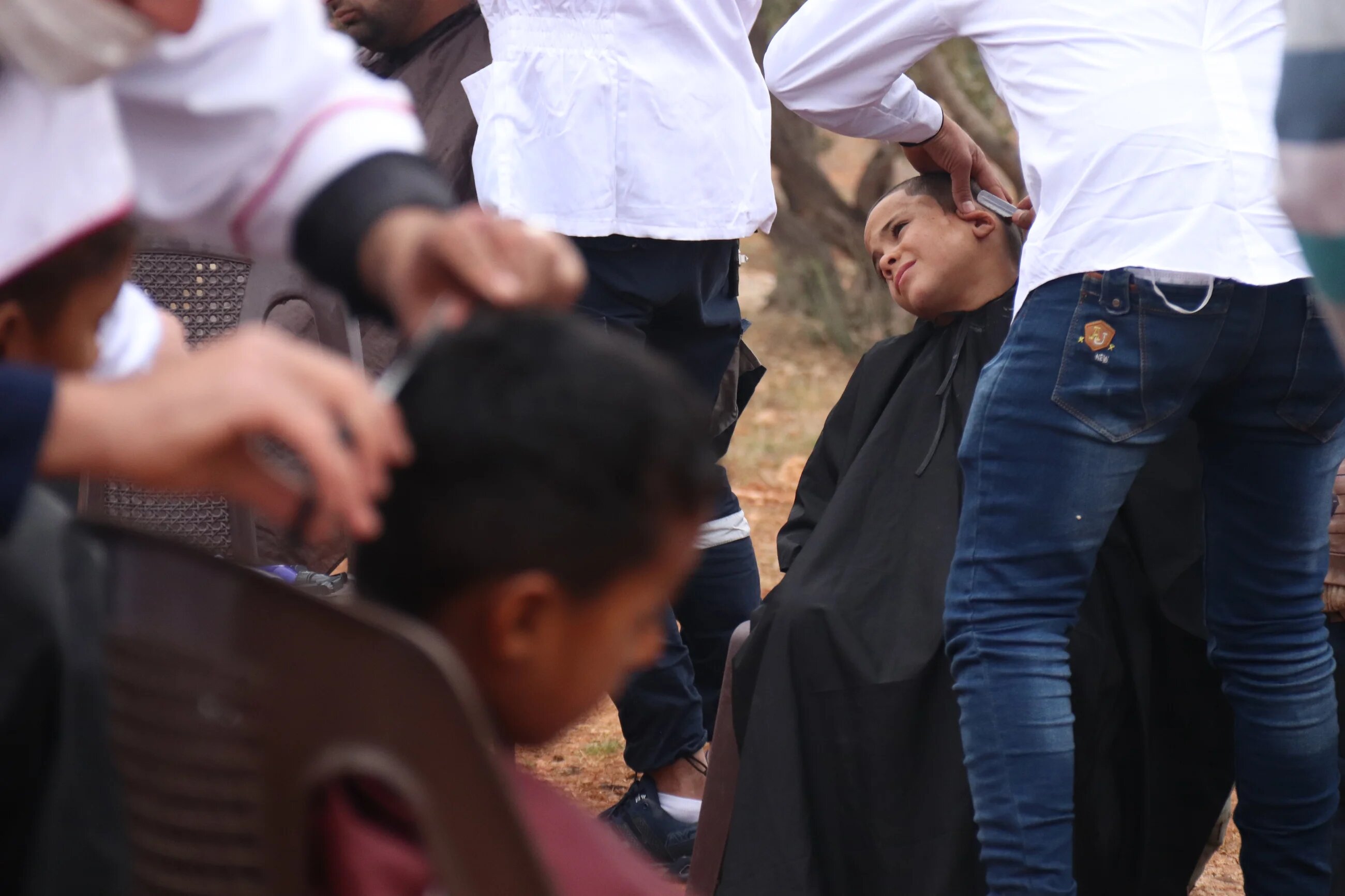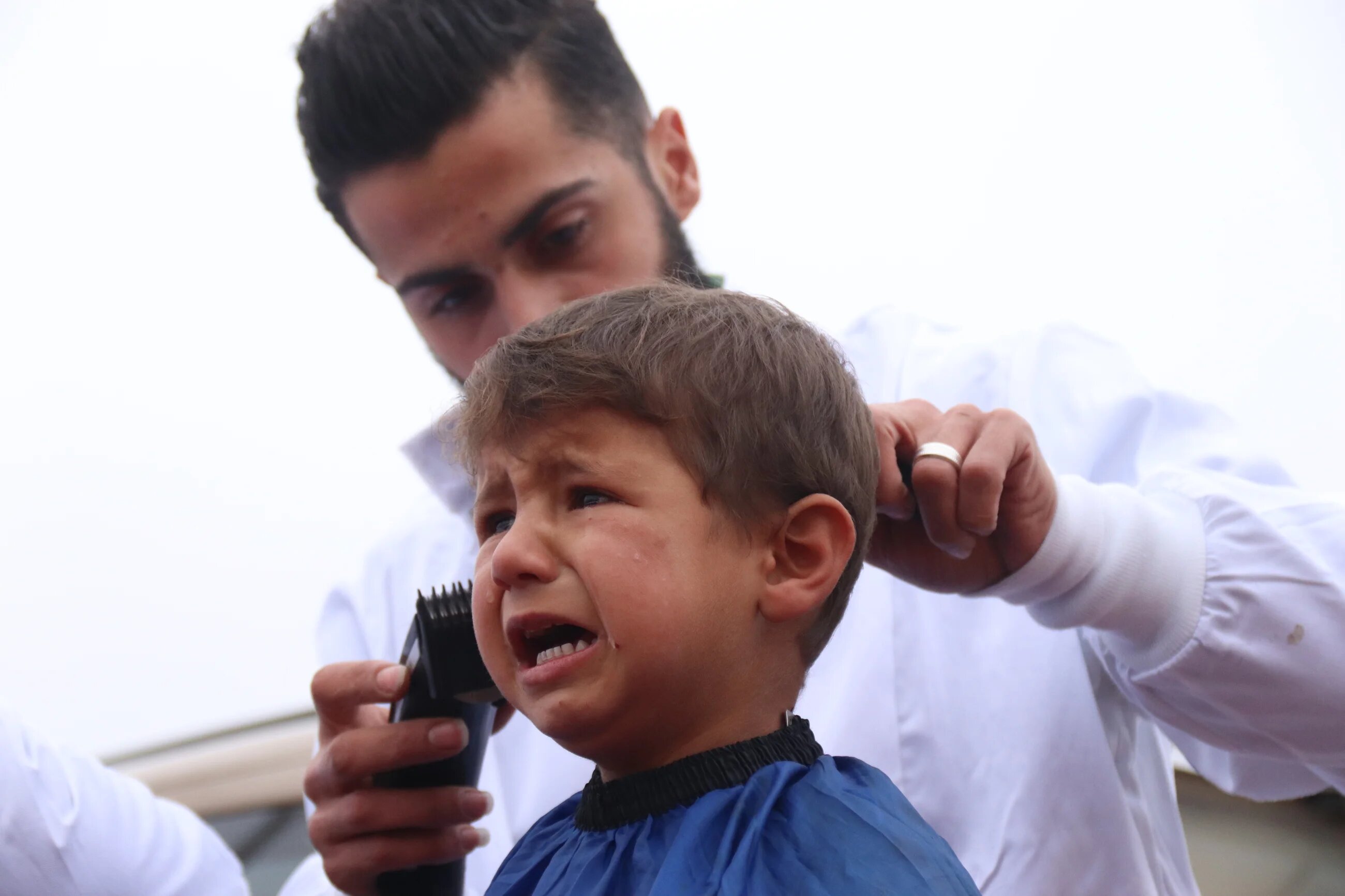 For some, a makeshift hair salon is a respite from poor conditions along the border area. “It’s been forever since I went to the barber,” one boy said, while a volunteer buzzed his hair. “Someone is remembering us, even if it’s just for a haircut.” (MEE/Muhammad Al Hosse)