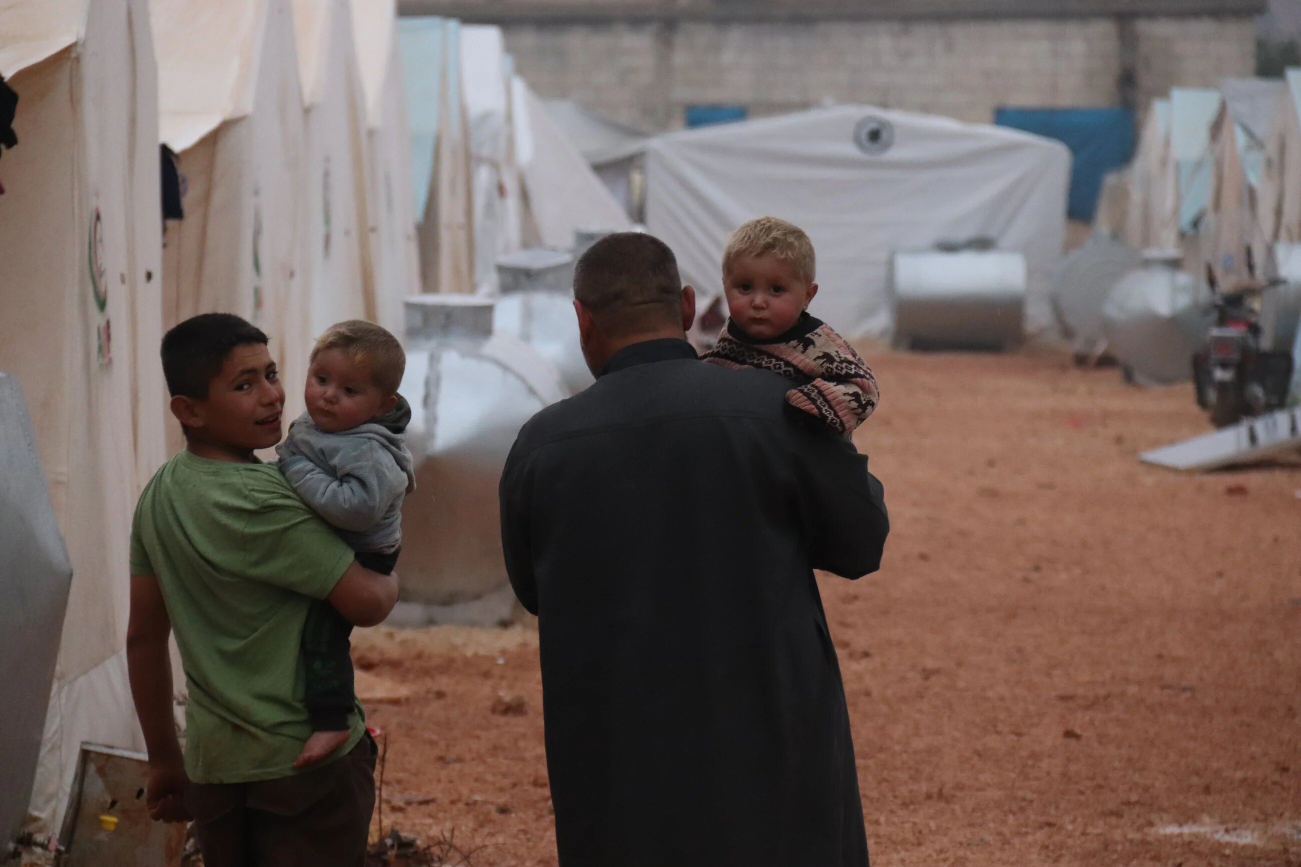 Seven-month-old twins are taken back to their family’s tent after haircuts, carried by their uncle and cousin. Their father was killed last month in an air strike, their uncle explains, while he had been out shopping in their hometown’s local market (MEE/Muhammad Al Hosse)
