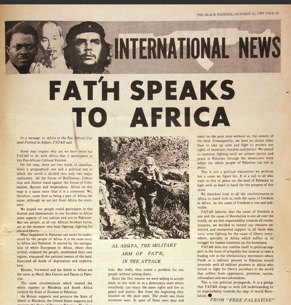 In 1969, the Black Panther Newsletter published the speech given by the PLO delegation during the Pan-African Cultural Festival. The PLO proclaimed boldly that Africa was not merely a continent but a cause, passionately arguing that Africa is the centre for all the forces of the world who stood against colonialism, racism, and imperialism. Addressing the crowd, the PLO stated that although they as Palestinians were not from Africa, their struggles and quest for freedom made them belong to the African cause. (The Black Panther)