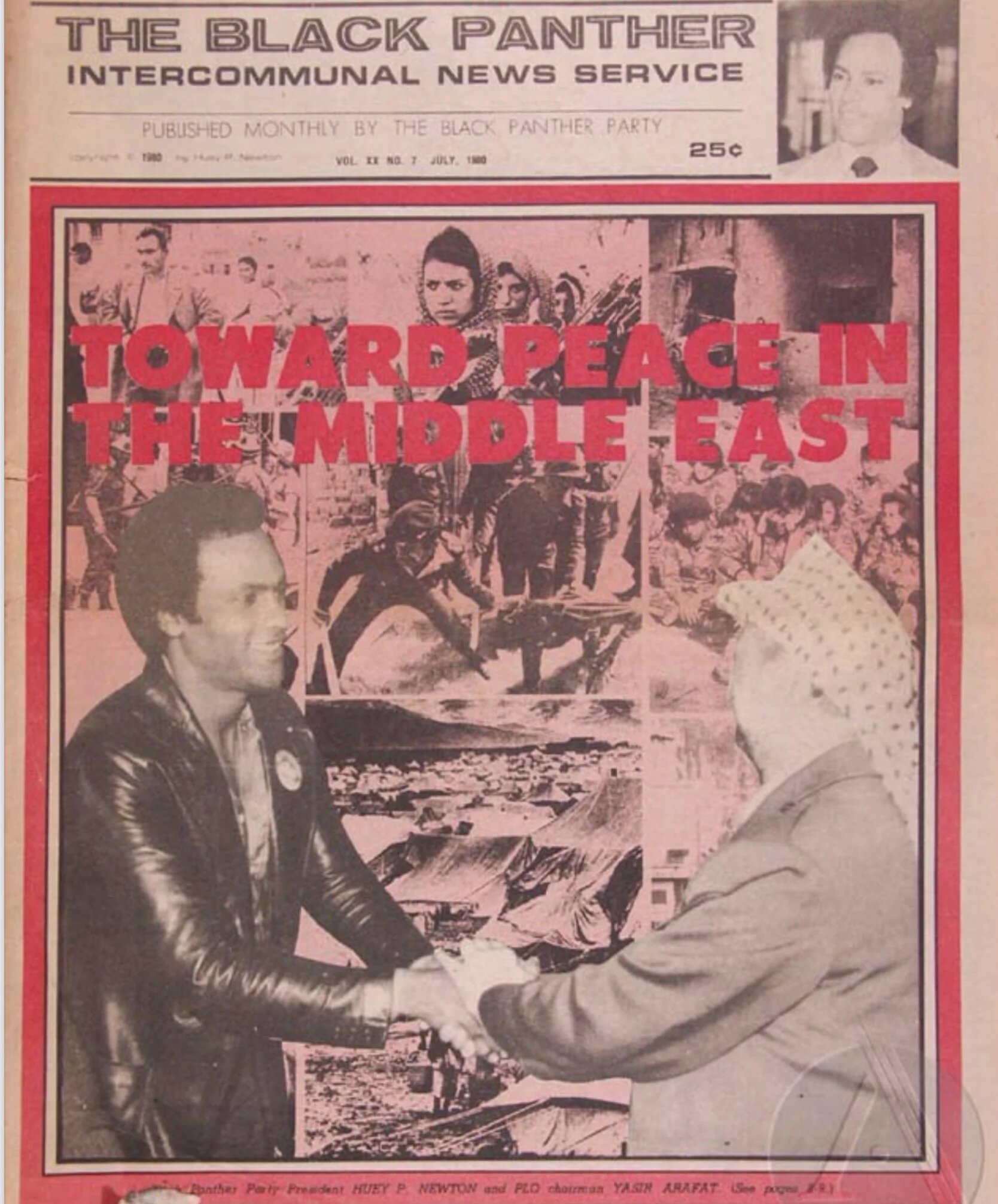 The Black Panther Newsletter published the photo above on the cover of its July 1980 issue. It shows Black Panther co-founder Huey P Newton meeting Yasser Arafat, chairman of the PLO, in Lebanon that year. The BPP and the PLO had established contact and solidarity networks since 1969. (The Black Panther, 1980)